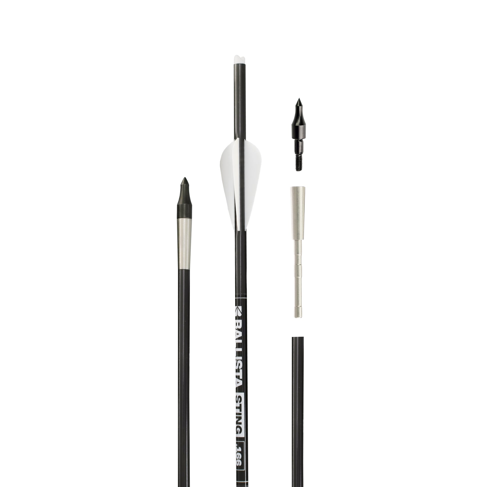 Built specifically for the BALLISTA Hawkwing, the STING 16″ carbon bolts deliver precise, high-energy shots: 16″ overall length with a 14″ carbon shaft, micro outer diameter 6.0 mm (ID 4.2 mm) and a spine of 400 for stable flight and reduced wind drift. Each bolt is fitted with three 1.75″ vanes on a 2.5° CCW helical to induce fast, consistent spin and tighter groups, a white half-moon nock indexed 90° to the fletching for repeatable alignment, and a 120-grain steel penetration insert (field point included) compatible with standard 7.6 mm field and broadhead fittings. At about 360 grains per bolt and sold in a ready-to-shoot pack of three, these bolts prioritize retained speed, improved downrange accuracy, and reliable penetration for hunting and precision shooting.