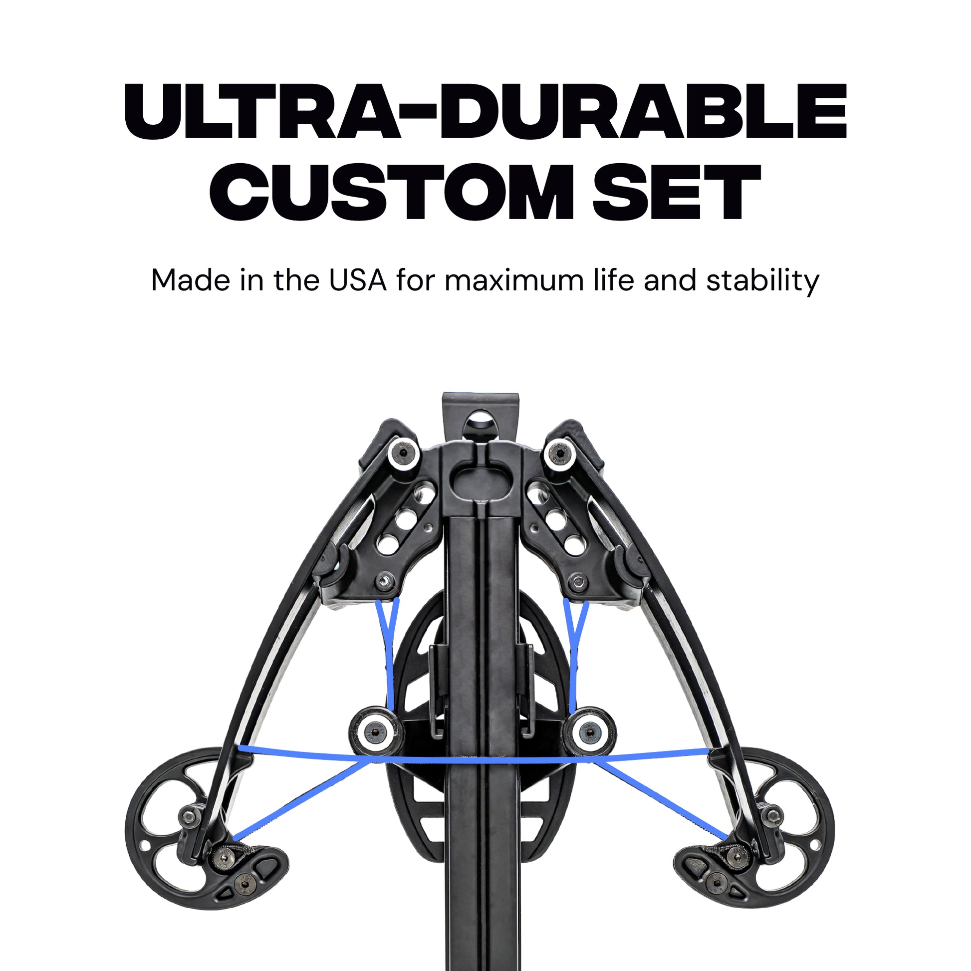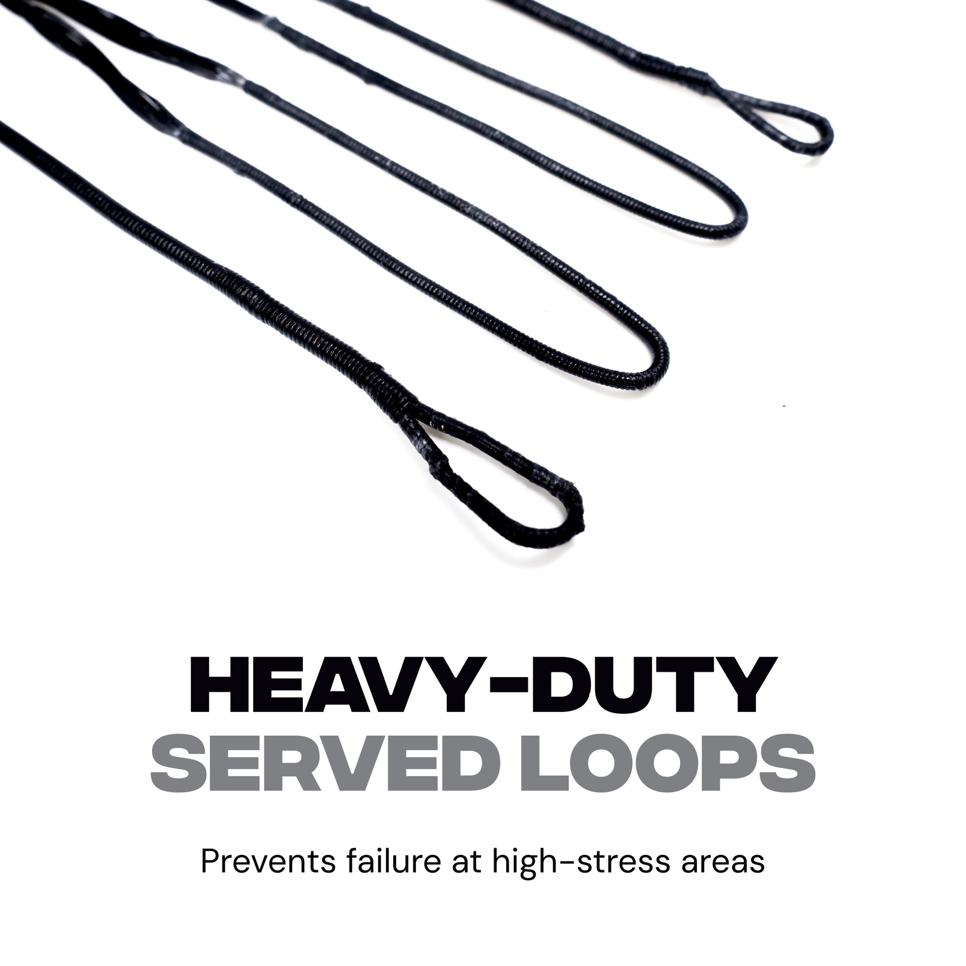 Premium heavy-duty set for the Ballista BAT. Hand-built in the USA with BCY X99 core fibers and 8-strand UHMWPE serving. Compared to standard sets, expect greater tensile strength, lower creep, quieter shots, and extended life. Color: black. Contents: 1× string, 2× cables.