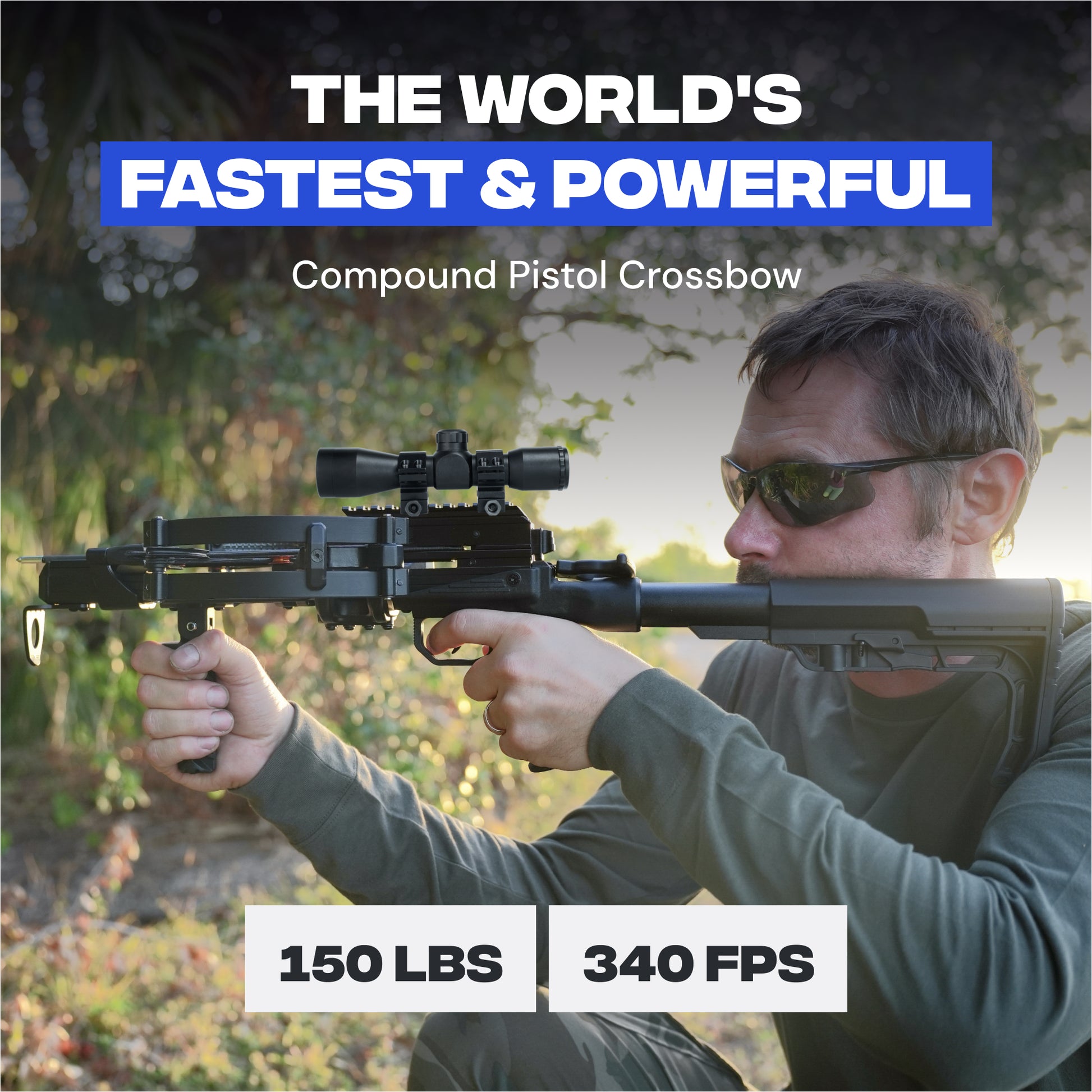 Weighing just 3.9 lbs, the crossbow delivers speeds up to 340 fps with silent, easy self-cocking — ideal for quick follow-up shots. The included STING bolts with micro-diameter shafts and half-moon nocks ensure tight groupings and deep penetration. Broadheads expand on contact for devastating wound channels, while the scope and lighted nocks keep your aim true in any light. Carry everything with confidence using the versatile 4-arrow quiver with Picatinny mount.