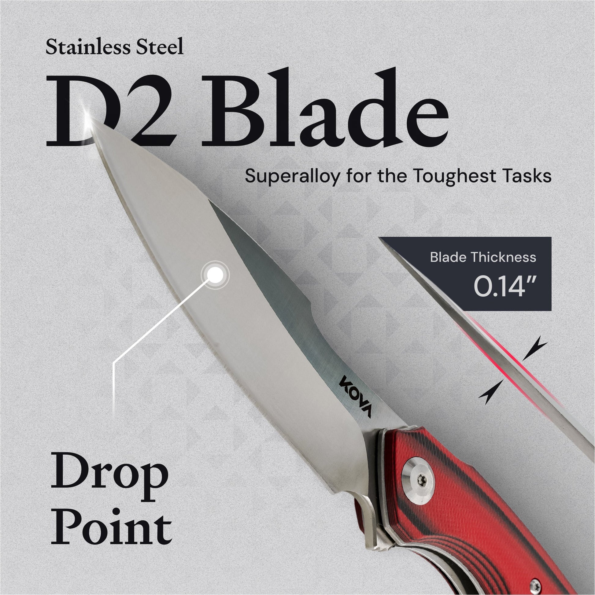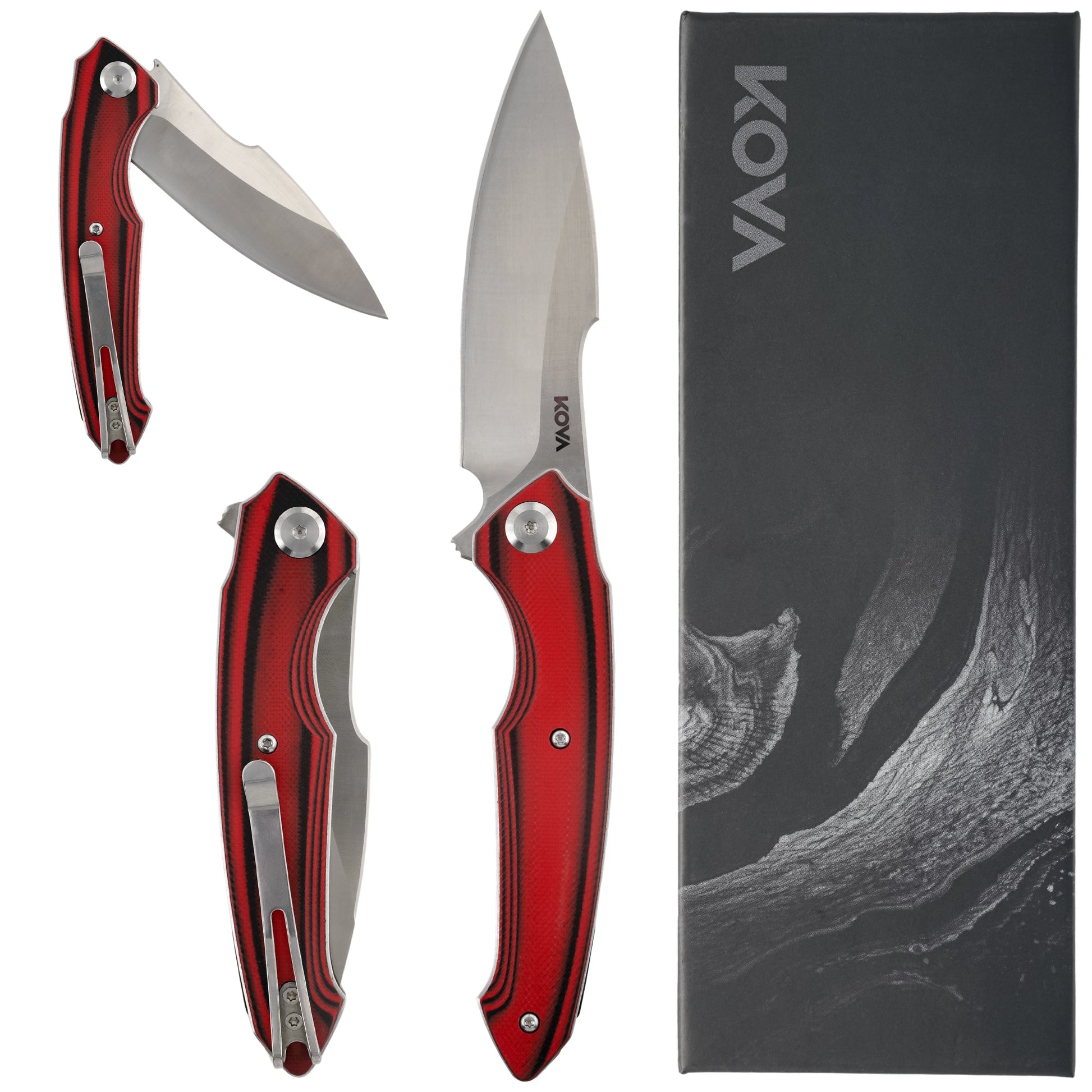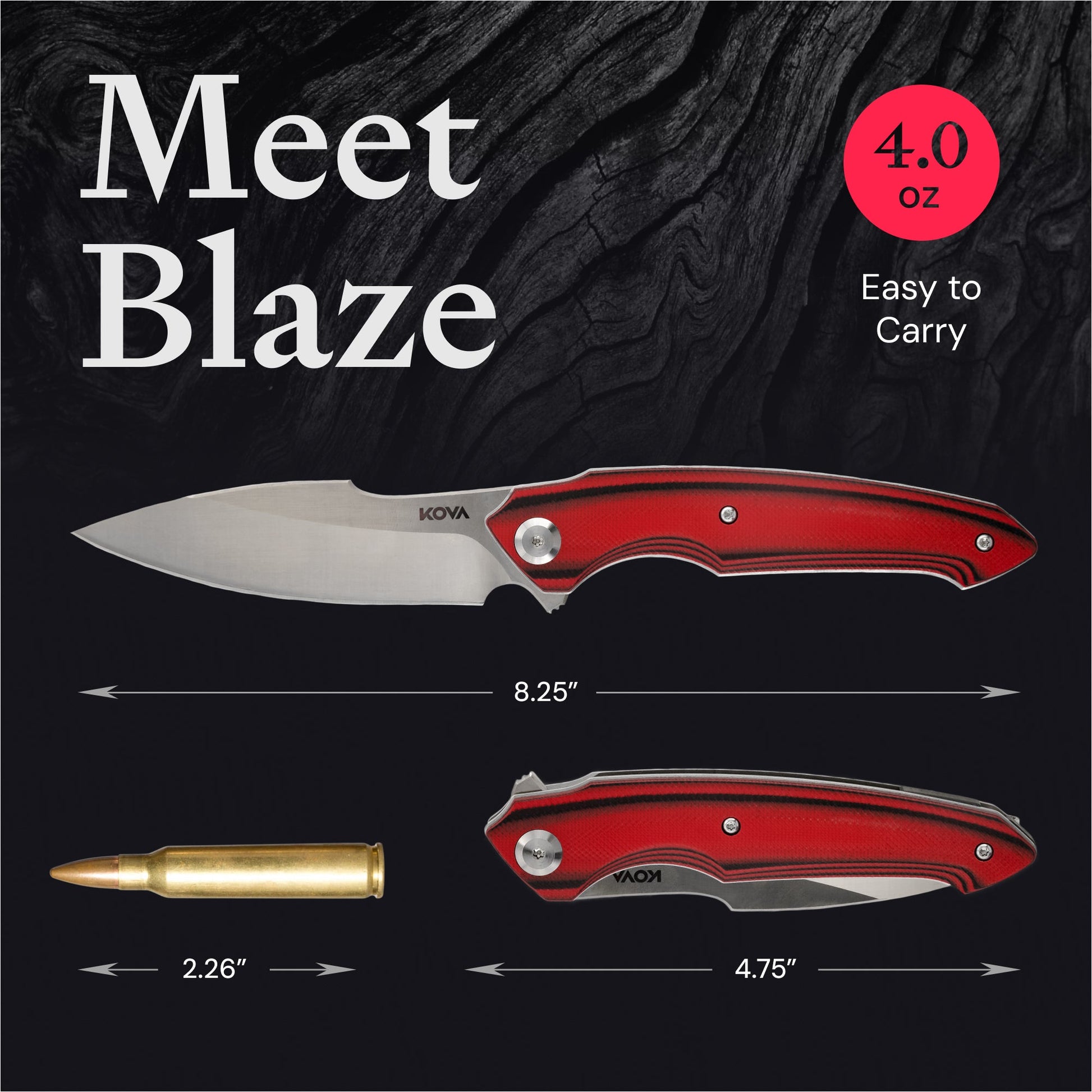 The KOVA Blade’s Blaze blends bold aesthetics with everyday functionality, making it a standout choice for those who value both performance and design. With an overall length of 8.25 inches and a 3.5-inch drop-point blade, this folding knife is built for everyday carry (EDC) and tactical use alike.
