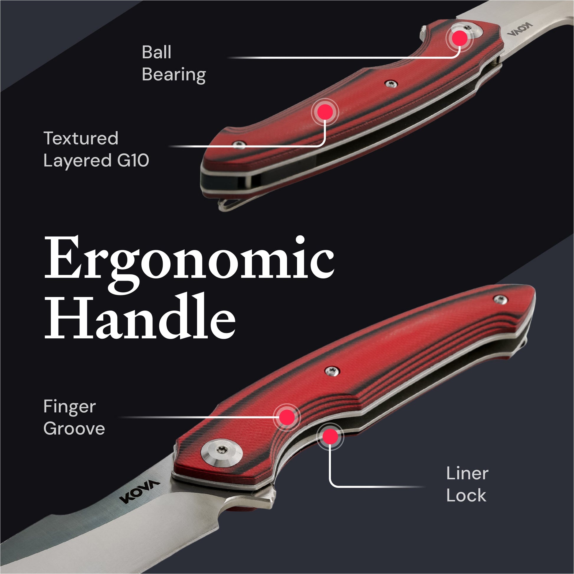 • Red & Black G10 Handle – Textured, ergonomic, and stylish for a confident grip.