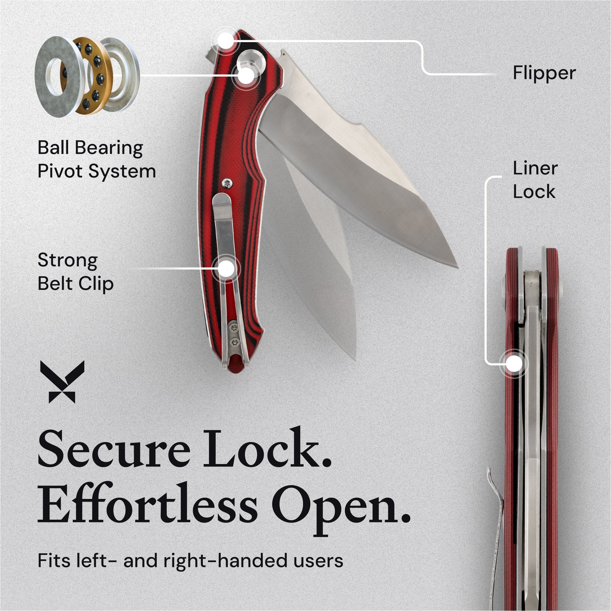 The blade is crafted from high-quality D2 stainless steel, offering excellent edge retention and toughness. A flipper tab combined with a ball-bearing pivot system ensures smooth, one-handed deployment, while the liner lock mechanism provides secure blade lock-up during use. The striking red and black layered G10 handle offers a textured, ergonomic grip for comfort and control in any condition. Weighing just 4 ounces, the Blaze delivers a perfect balance of portability and utility. The tip-down pocket clip offers convenient, discreet carry.