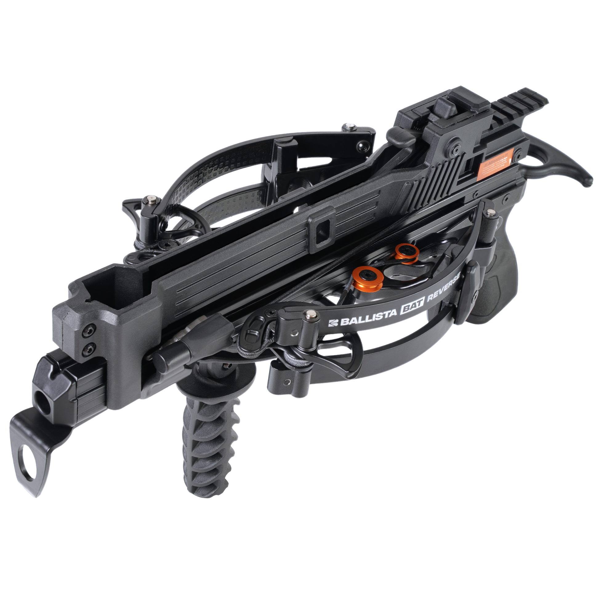 Equipped with 150 lbs limbs as standard, the Ballista BAT Reverse is the most powerful compound pistol crossbow. Its exceptional power makes it perfect for recreation, sports, and entertainment, as well as hunting and even self-defense.