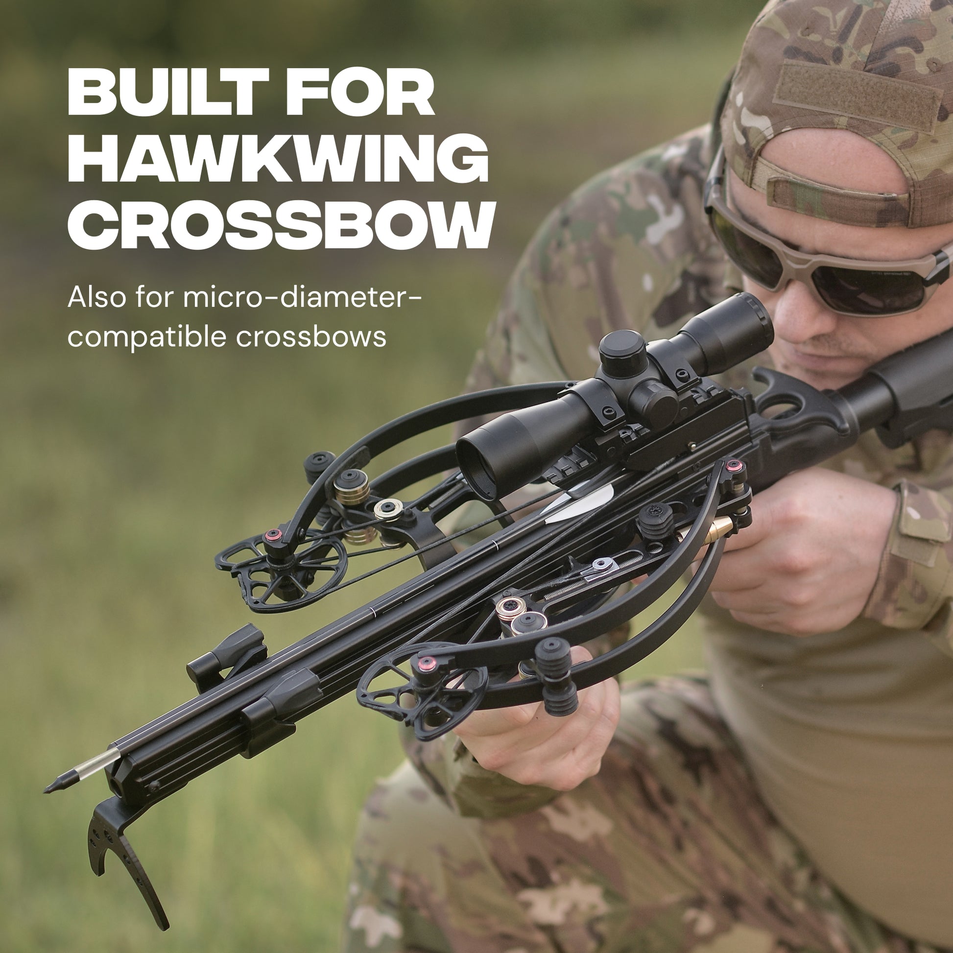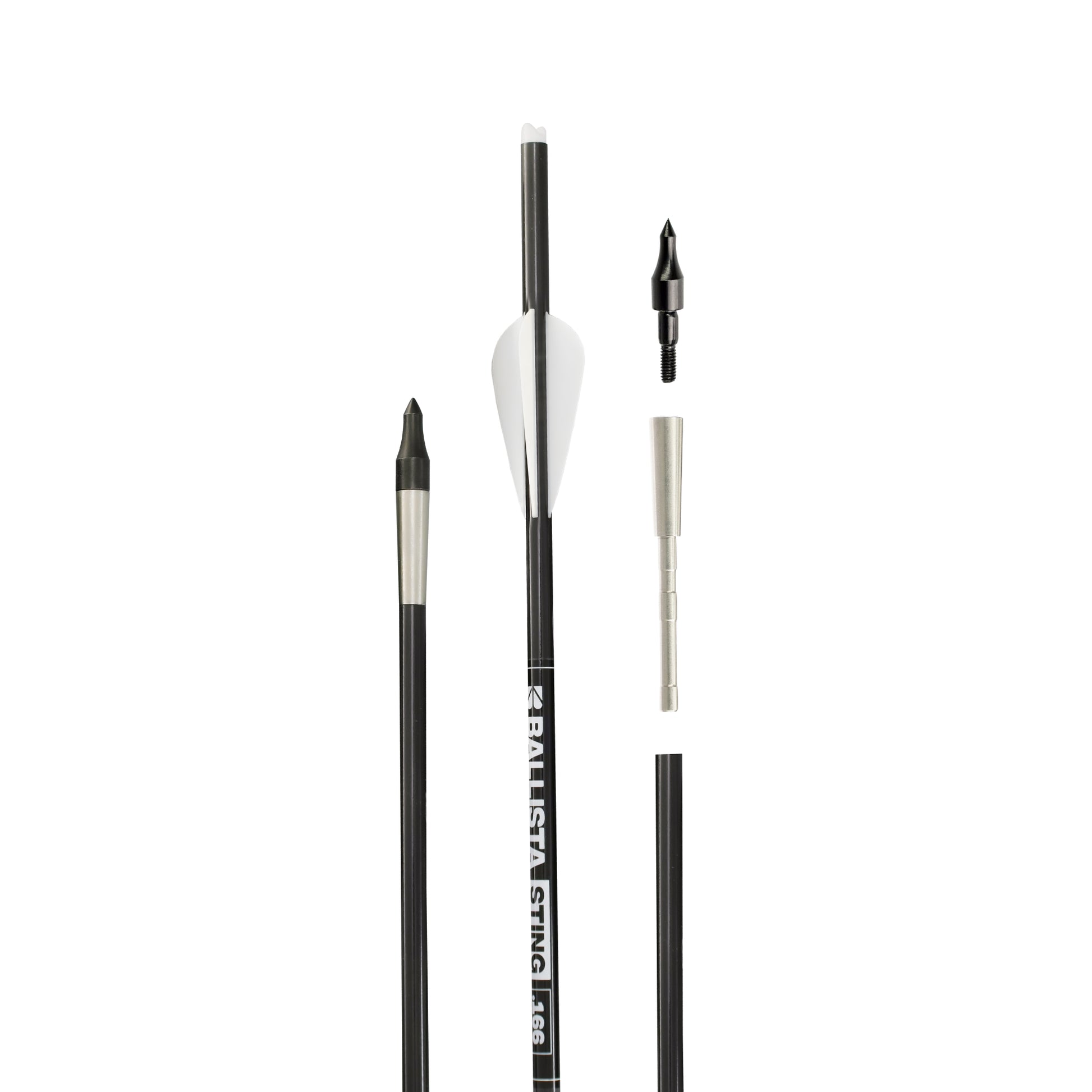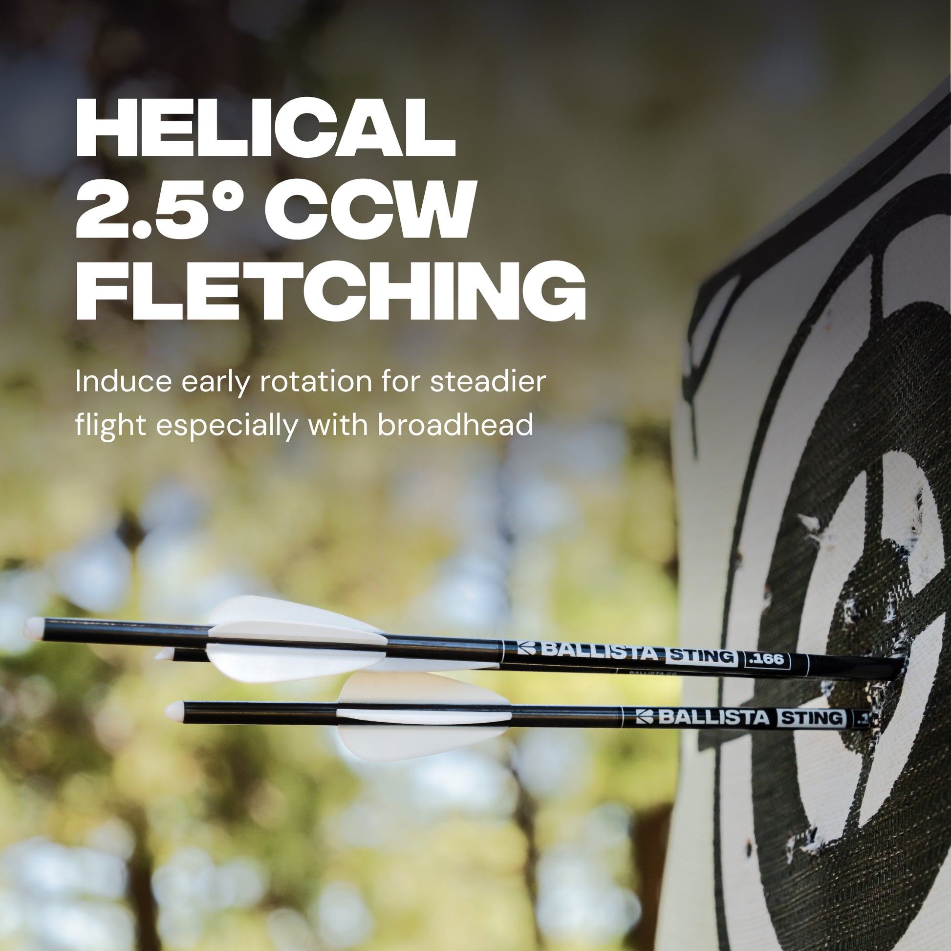Purpose-built for the BALLISTA Hawkwing crossbow, Sting 16" Helical Carbon Bolts combine micro-diameter aerodynamics with rotation-boosting fletching for stable, repeatable accuracy. Each bolt uses a varnished 14" carbon shaft with a 6.0 mm outer diameter, 4.2 mm inner diameter, and 400 spine, then finishes at 16" overall length with a white half-moon nock indexed 90° from the vanes.