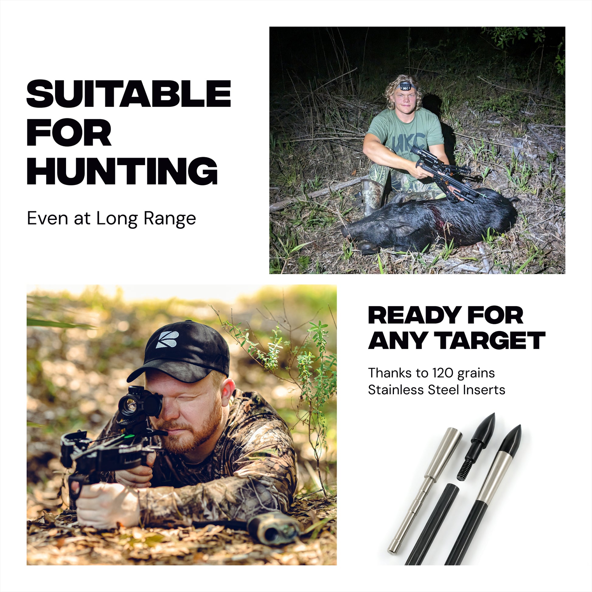 The fletching is the difference maker: three 1.75" vanes are set at a 2.5-degree counter-clockwise helical, which spins the bolt up faster to smooth out shaft and broadhead imperfections and tighten groups. Up front, a 120-grain stainless-steel penetrator insert bumps FOC for steadier flight and deeper entry, and it threads to standard 7.6 mm field points and broadheads (steel field tip included).