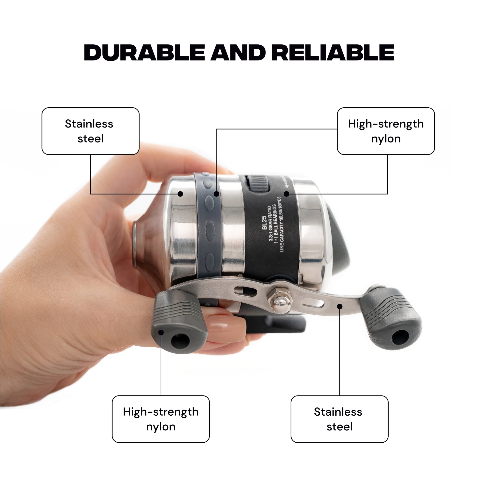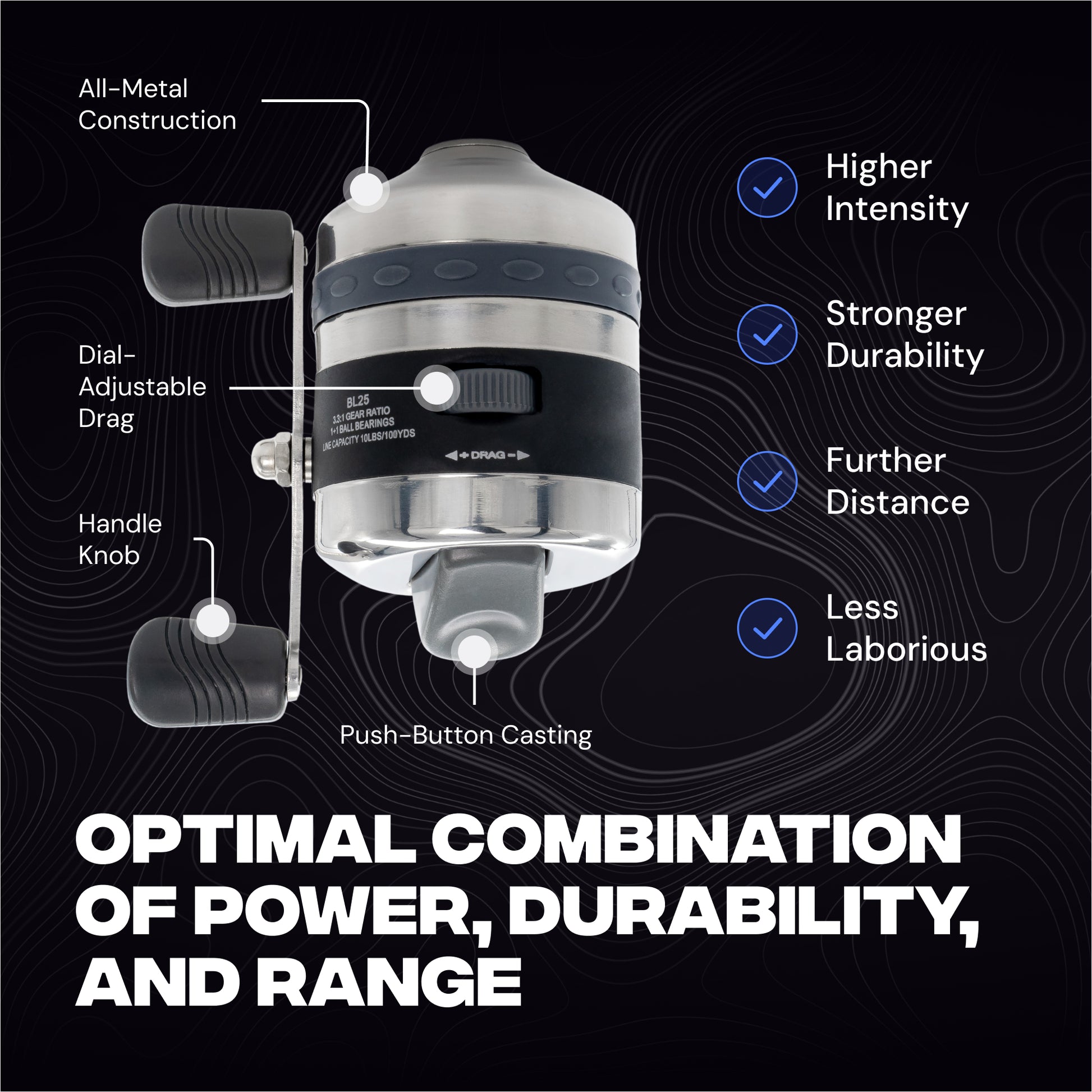 BALLISTA BL25 is a simple and reliable spincast fishing reel, it’s made of stainless steel that prevents corrosion. The internal gears are made of die-cast alloy and provide reliability and a smooth feel.