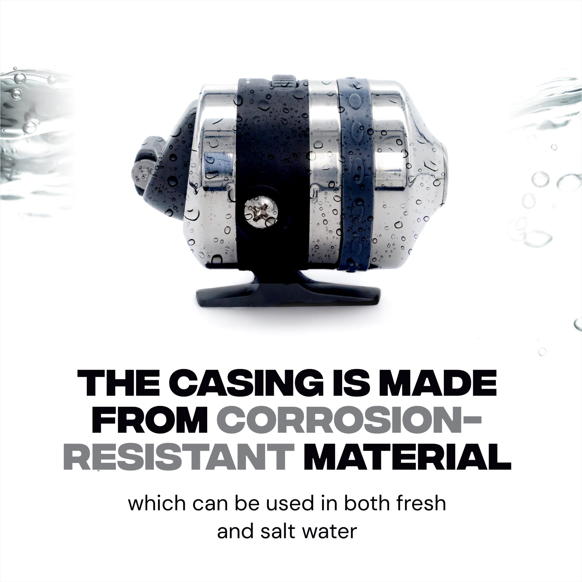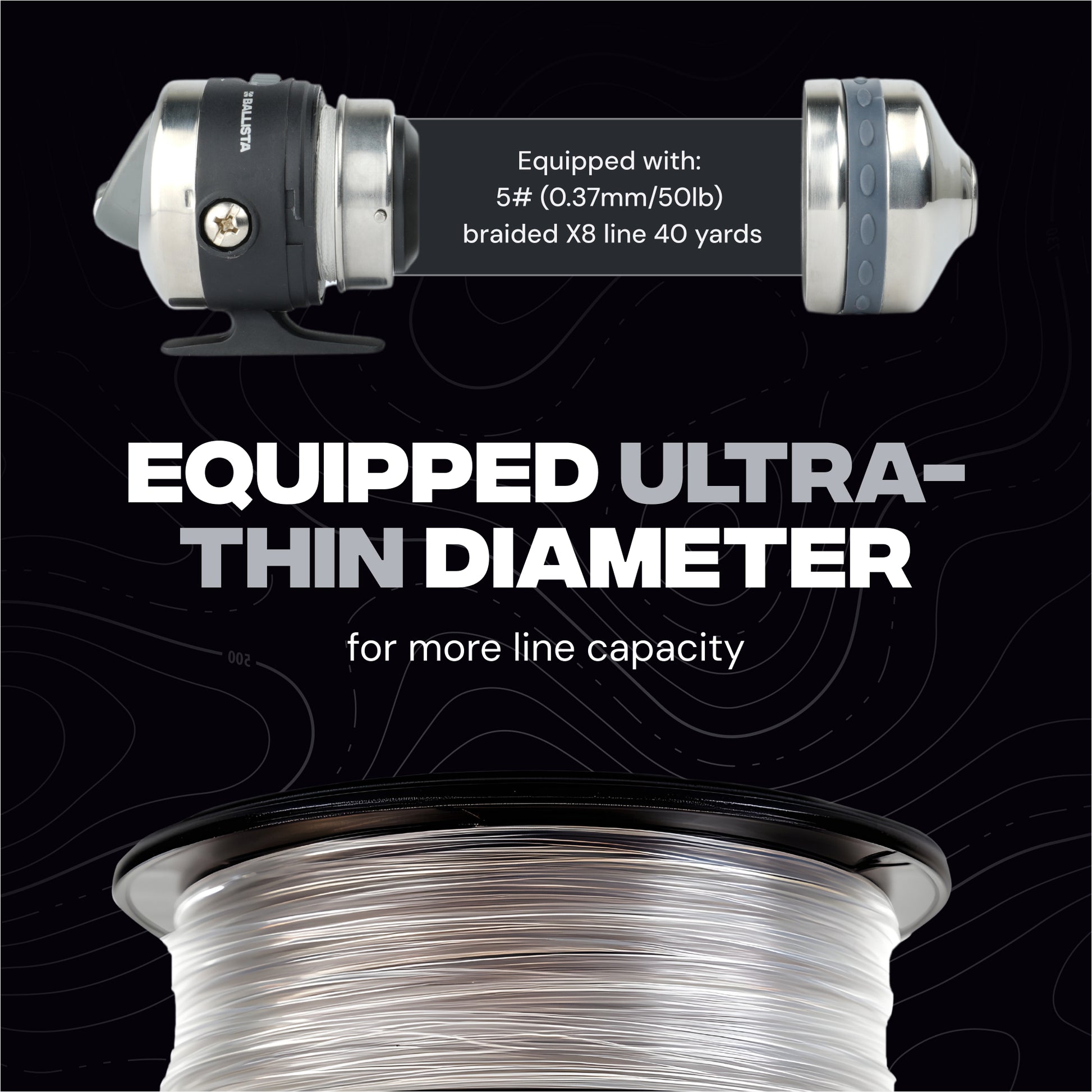 The spincast reel is equipped with a strong line 5# (0.37mm/50 lb) 40 yards specially for bowfishing and slingshot fishing. The line capacity of the reel with a line 0.6# (0.12mm/8lb) – 100 yards can be used for fishing with a casting rod.