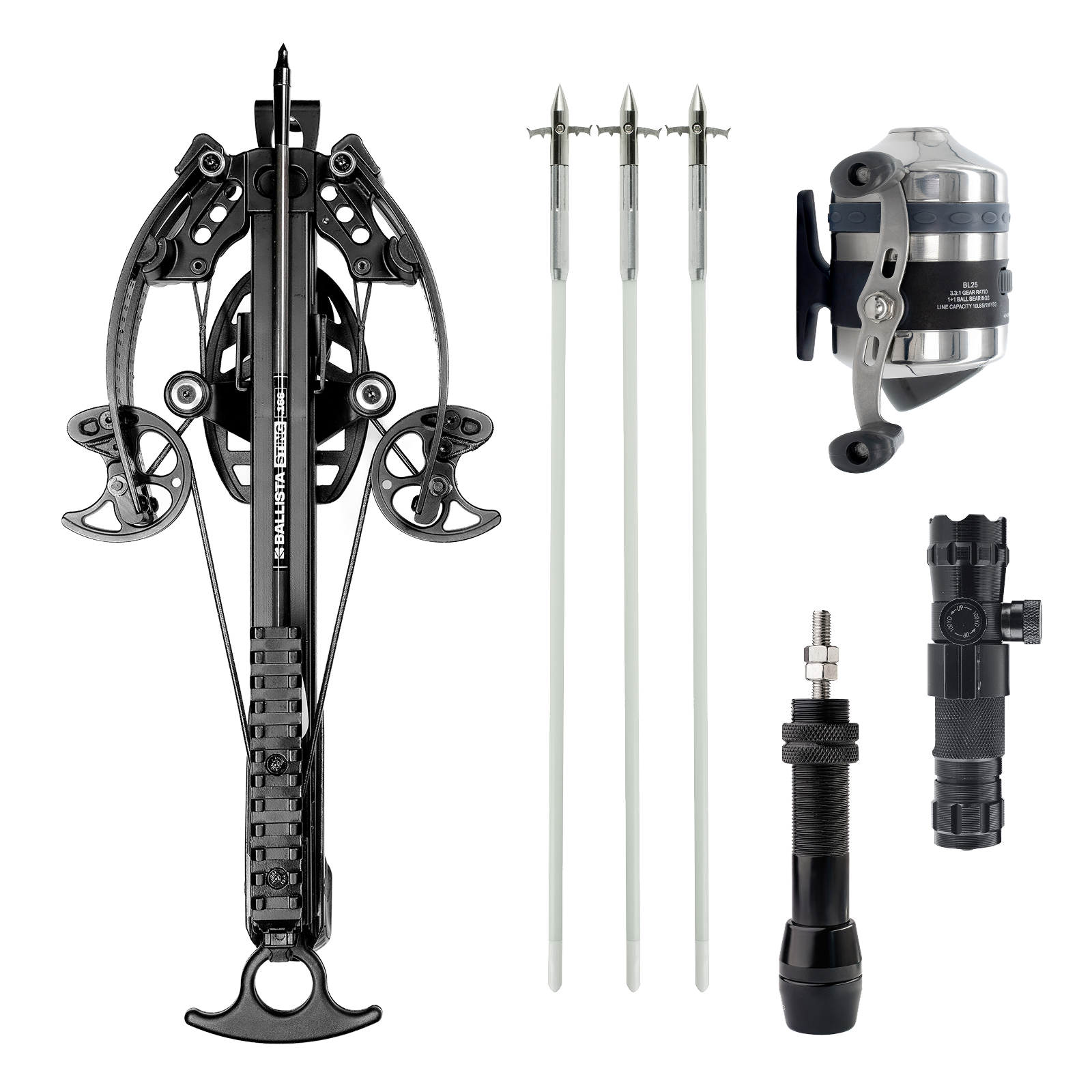 Dive into bowfishing with the BAT Bowfishing Bundle, perfect for anglers targeting small to medium-sized fish. This all-in-one package includes everything you need for a successful fishing adventure: the precision Ballista BAT crossbow, a set of 3 bowfishing arrows, a sturdy reel mount, the reliable Ballista BL25 Spincast reel, and a tactical green laser sight for enhanced accuracy.
