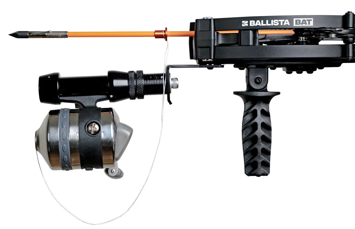 Ballista BAT Crossbow can be used for bow fishing by installing a regular spinning reel or a special bow fishing one.To do this, you need to use the standard Bowfishing Reel Seat Mount which is installed on the front stop (bracket-stirrup)