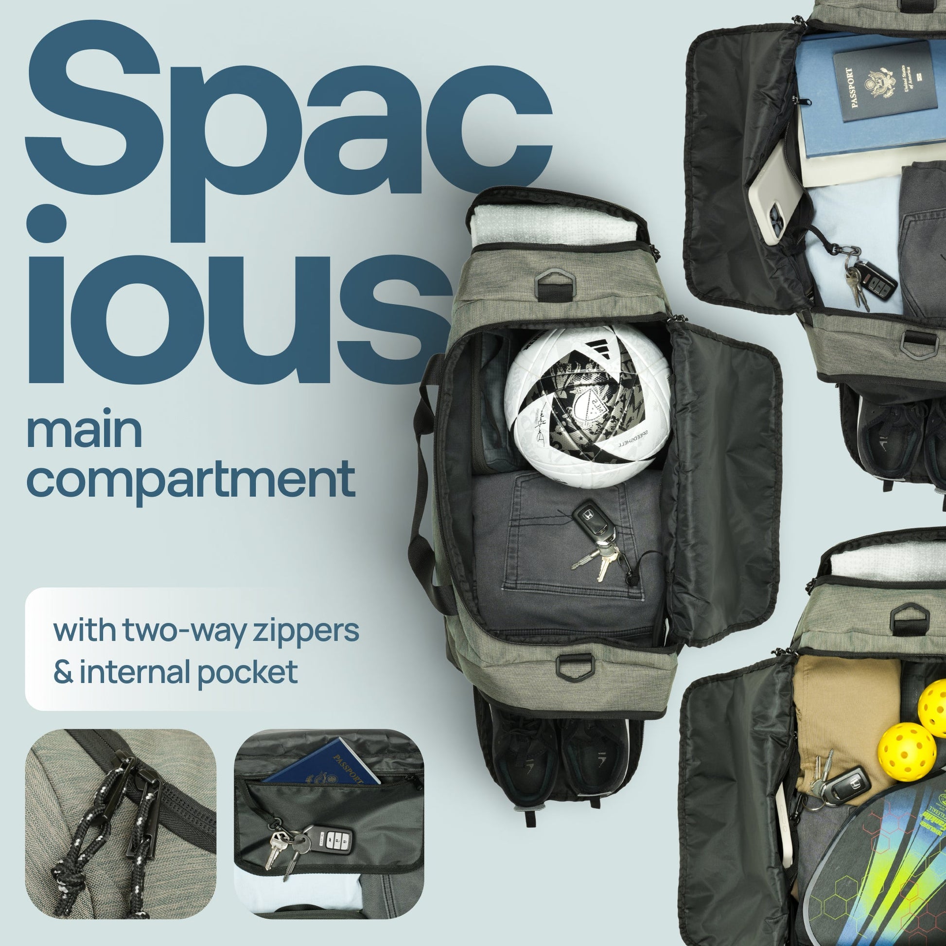 - Ample Storage Space: Stay organized with multiple zipped pockets including a main compartment with two-way zippers, a front zipper pocket, one side zipper compartment of duffle bag with shoe compartment. An internal pocket is perfect for small items and has a key hook.