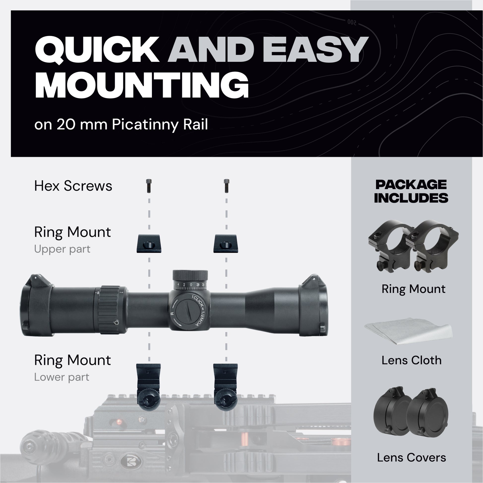 To ensure a secure and stable setup, this scope comes with a pair of 30mm Low Profile Picatinny Scope Rings made from durable aircraft-grade aluminum. Designed for standard 20mm Picatinny rails, these rings offer a firm grip with a matte black finish that resists glare and corrosion. Their low-profile design provides a sleek fit and optimal eye alignment, while the 1cm saddle height maintains a compact shooting profile—perfect for crossbows where balance and clearance matter.