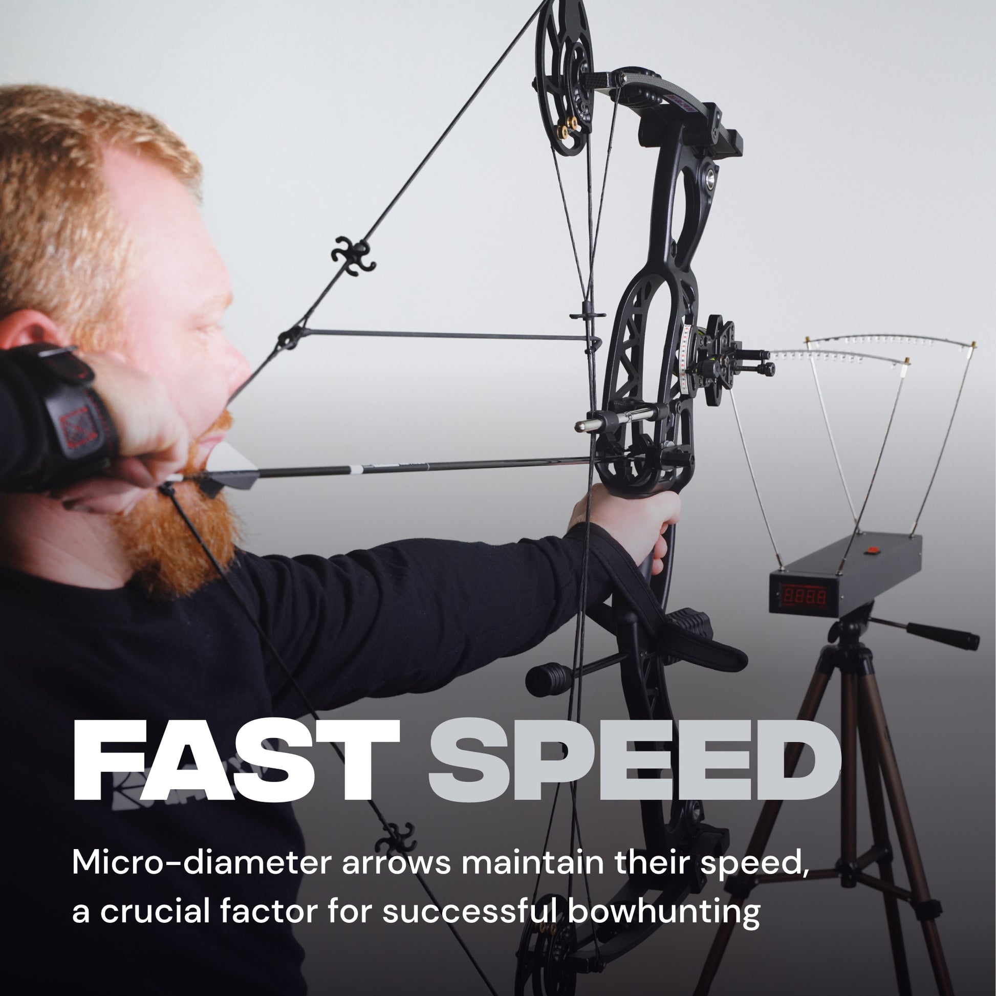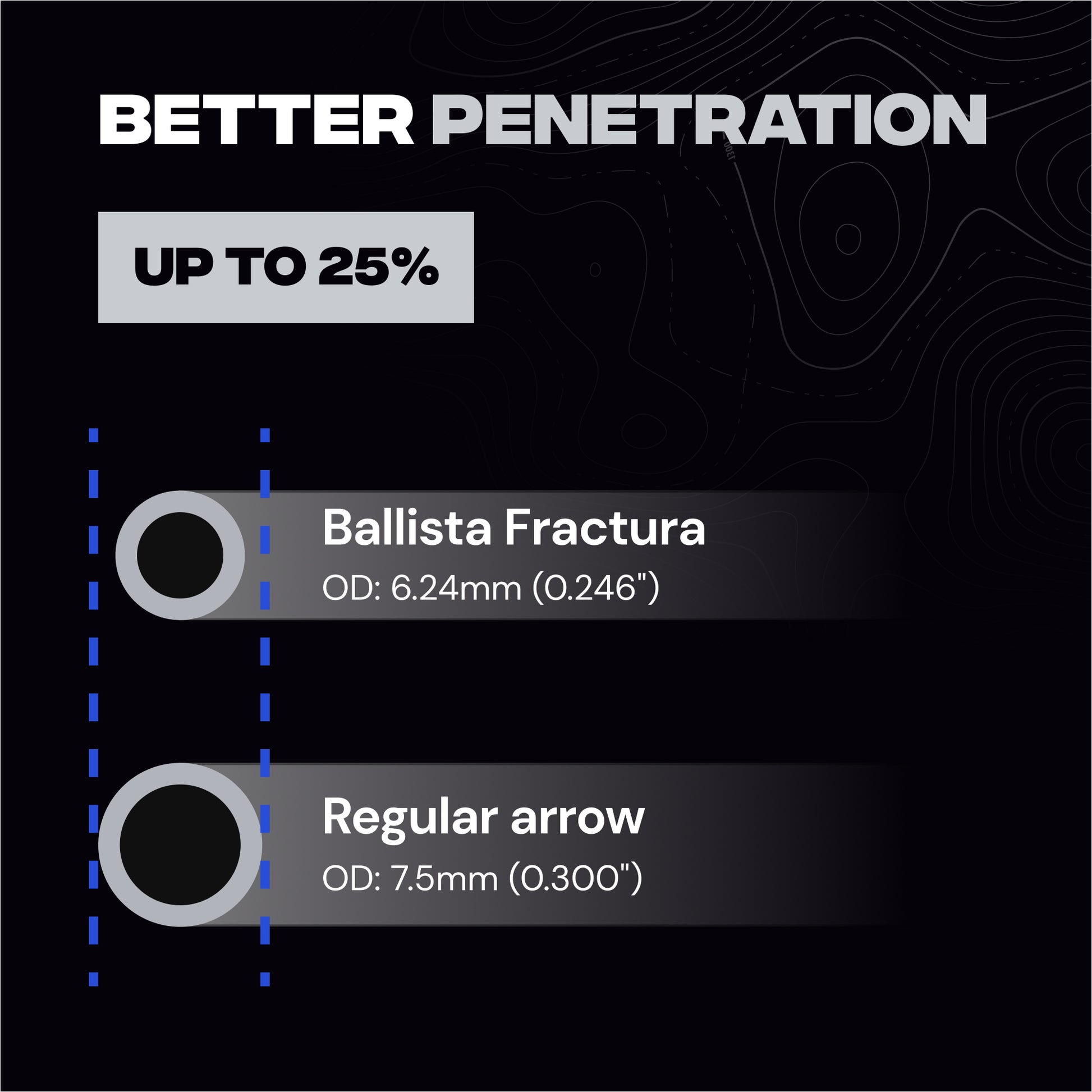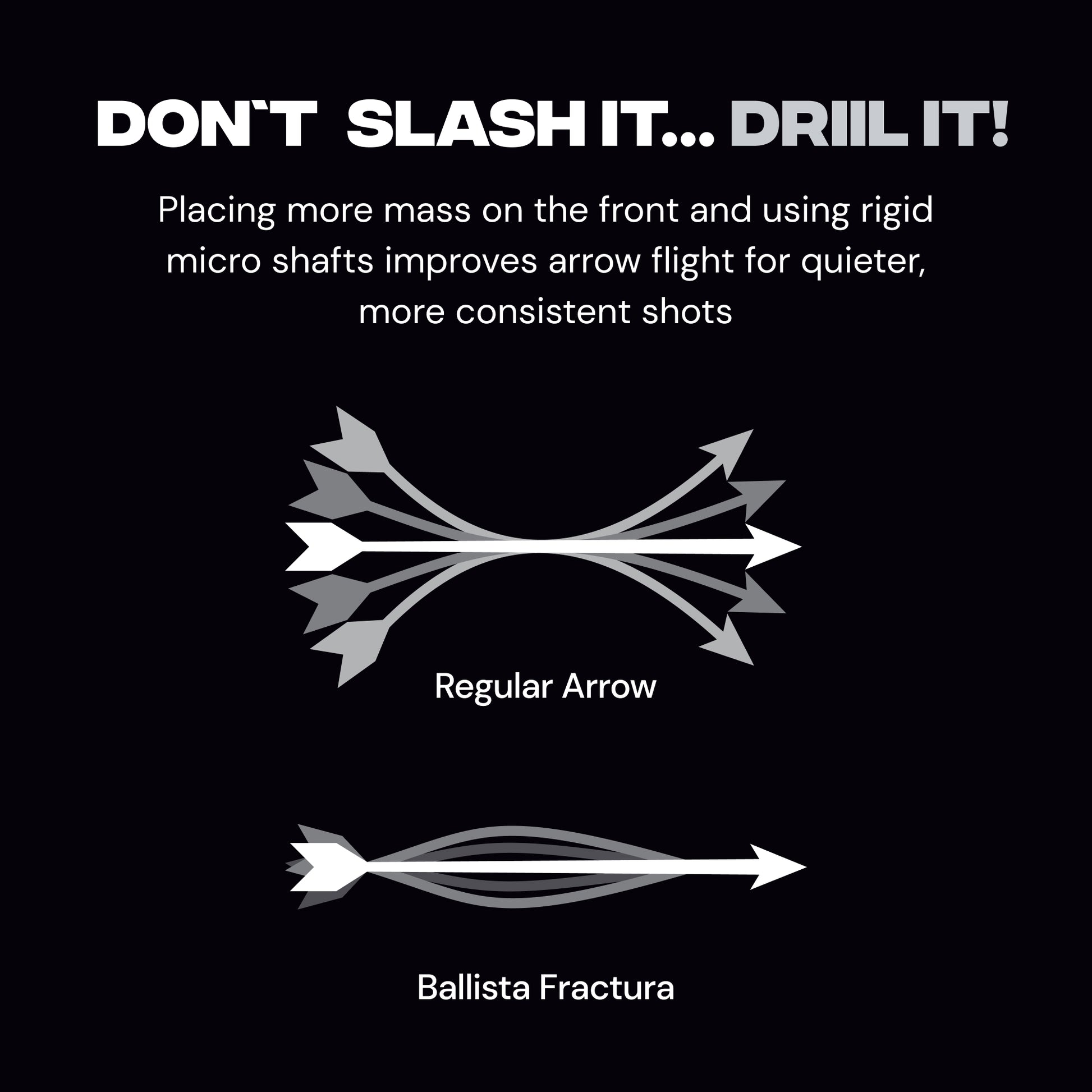 These high-performance Ballista Fractura black carbon hunting arrows feature a micro-diameter design for enhanced downrange velocity, better penetration, and reduced wind drift. Crafted with 100% high modulus carbon fiber for strength and durability, the arrows come in a set of 6 with a 30-inch length. The special coating improves penetration and allows for easy removal from targets, while the straightness and spine alignment ensure increased accuracy and tighter grouping. With the ability to adjust the arrow weight by replacing the insert and tip, these versatile arrows are ideal for compound and recurve bow hunting.