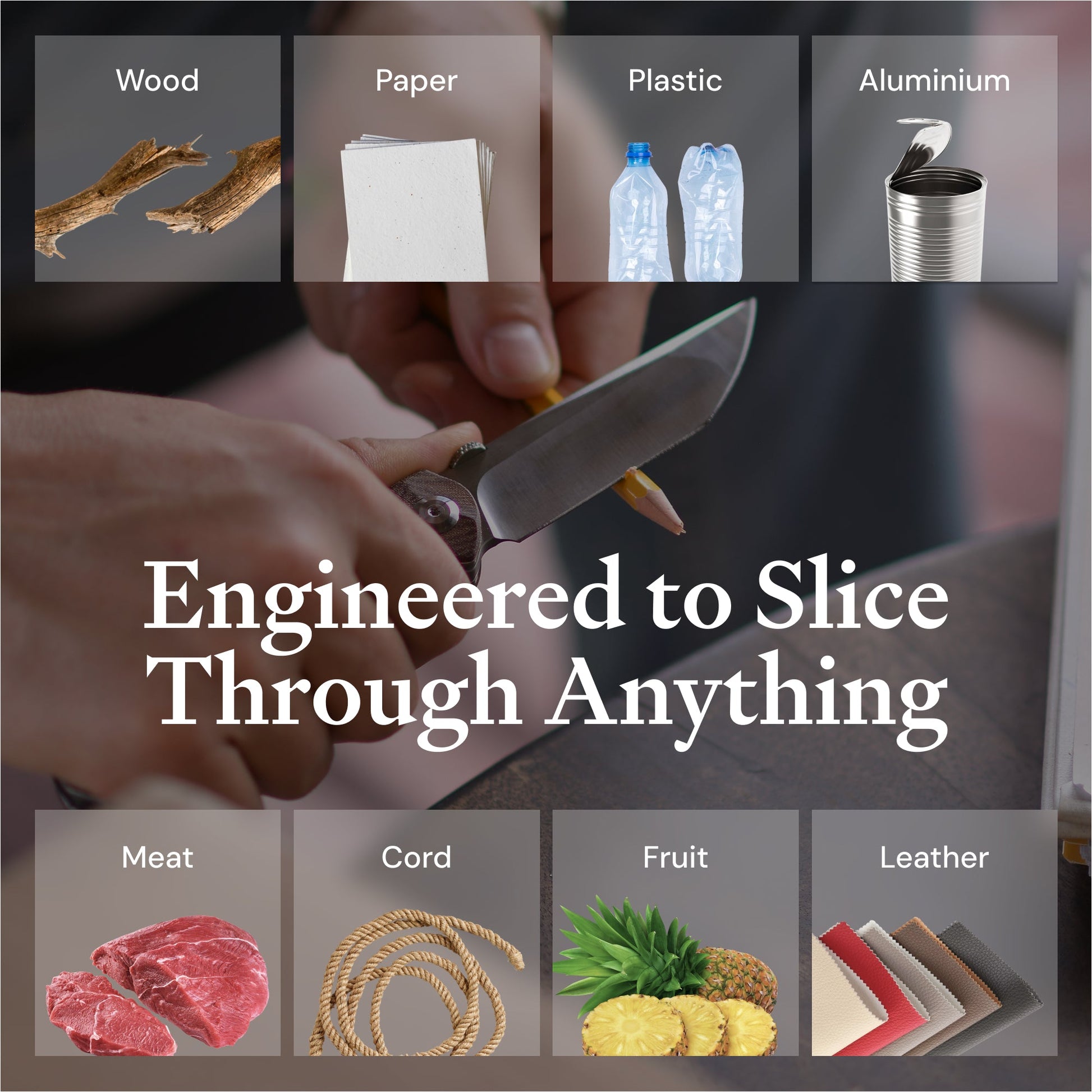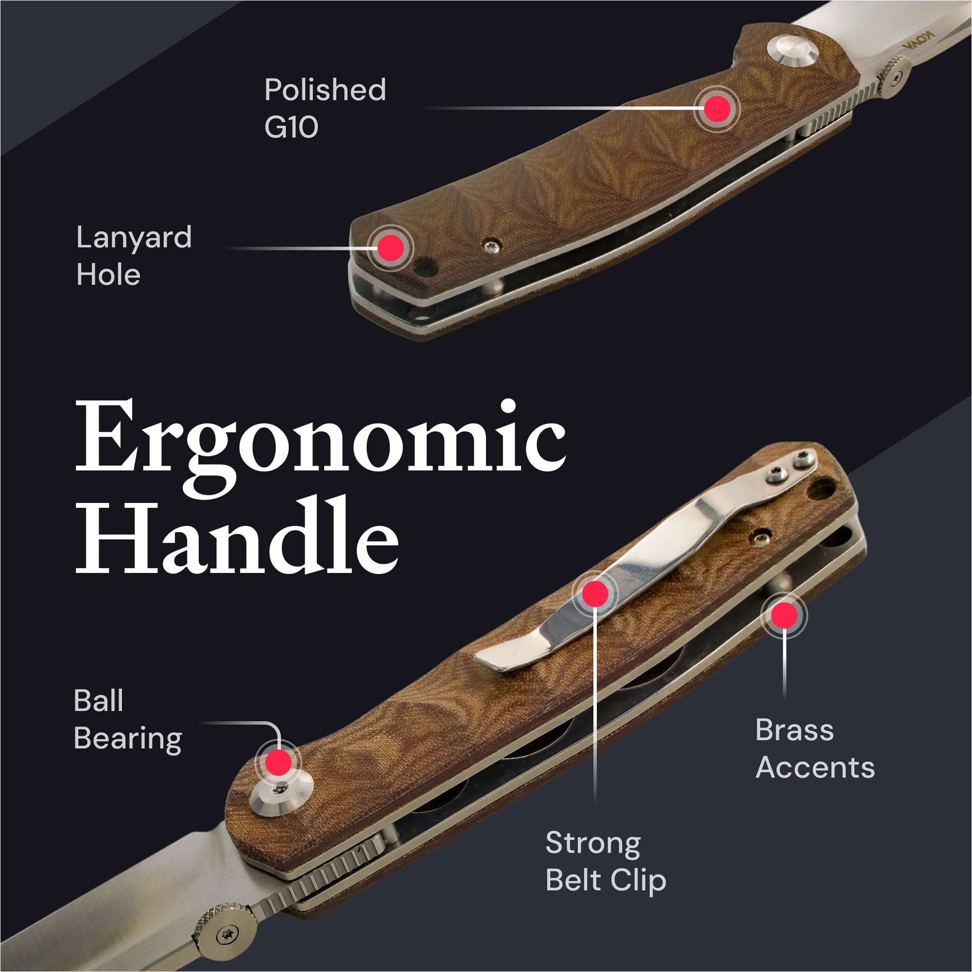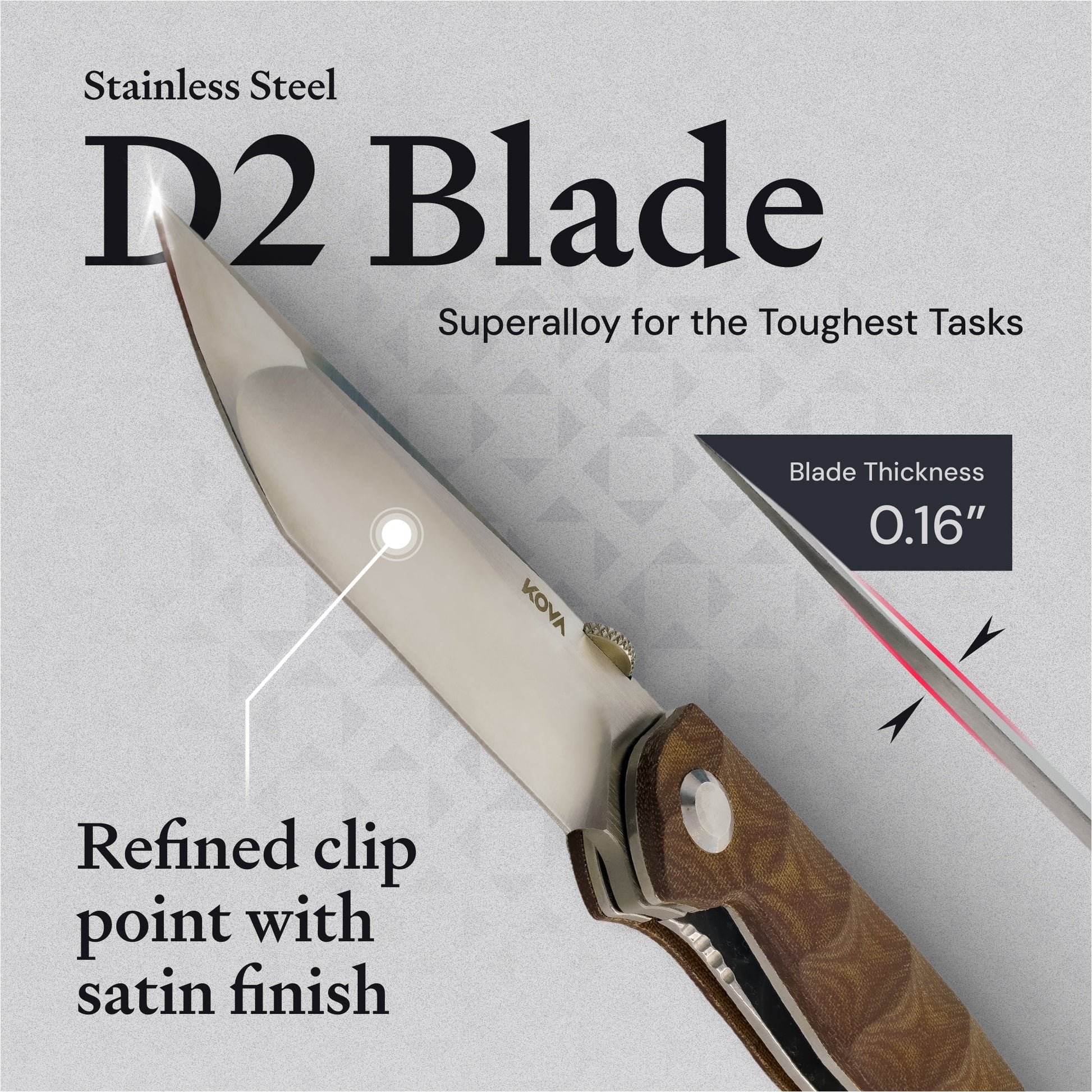 - D2 Steel Blade – Known for its hardness, edge retention, and corrosion resistance.