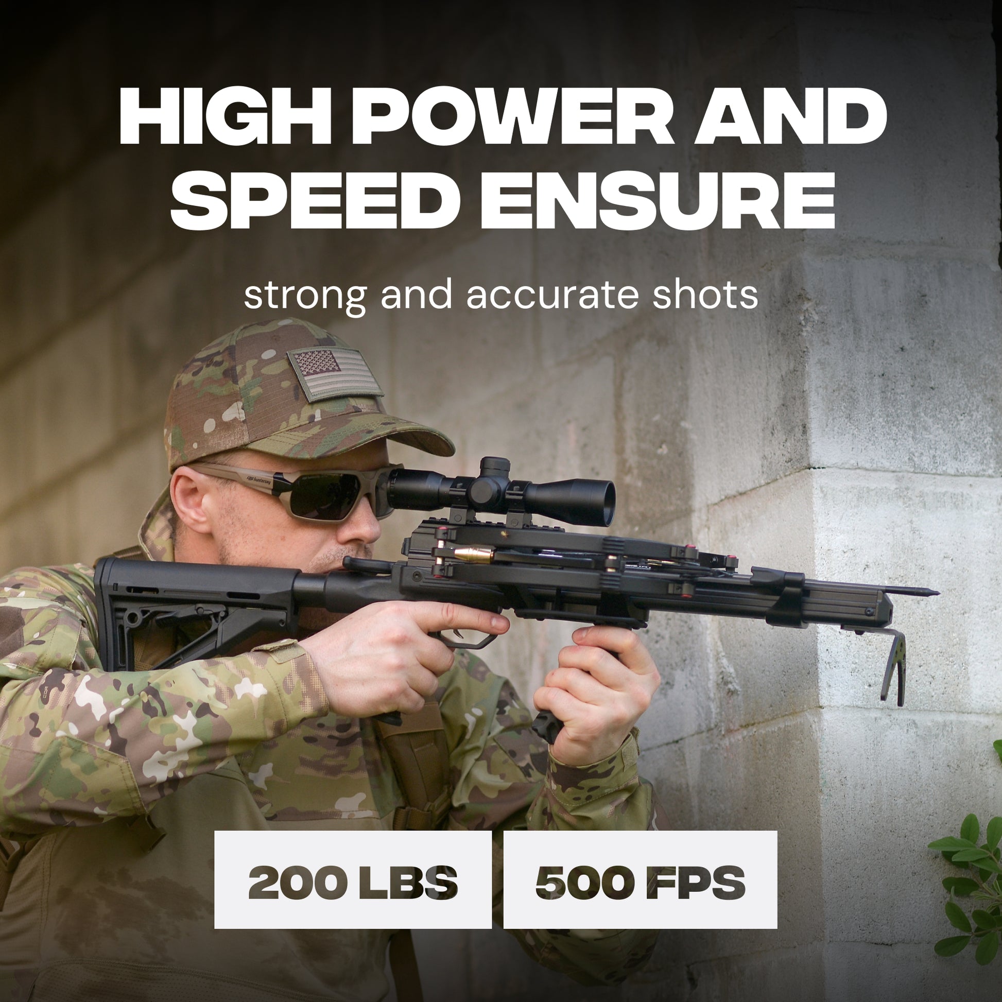 At the heart of the bundle is the Hawkwing crossbow. Its dual-cable system and micro-adjustable limb poundage deliver up to 500 FPS with light 150 gr 14" bolts, about 425 FPS with 250 gr 16" bolts, and about 340 FPS with 363 gr hunting arrows. Cocked width is just 5.9" axle-to-axle and overall length with the L-Stock stays under 19", so it’s easy to maneuver in tight blinds, tree stands, and brush. A built-in self-retracting cocking assist, automatic anti-dry-fire, and approximately 4.8 lb carry weight complete a compact, fast-handling hunting crossbow.