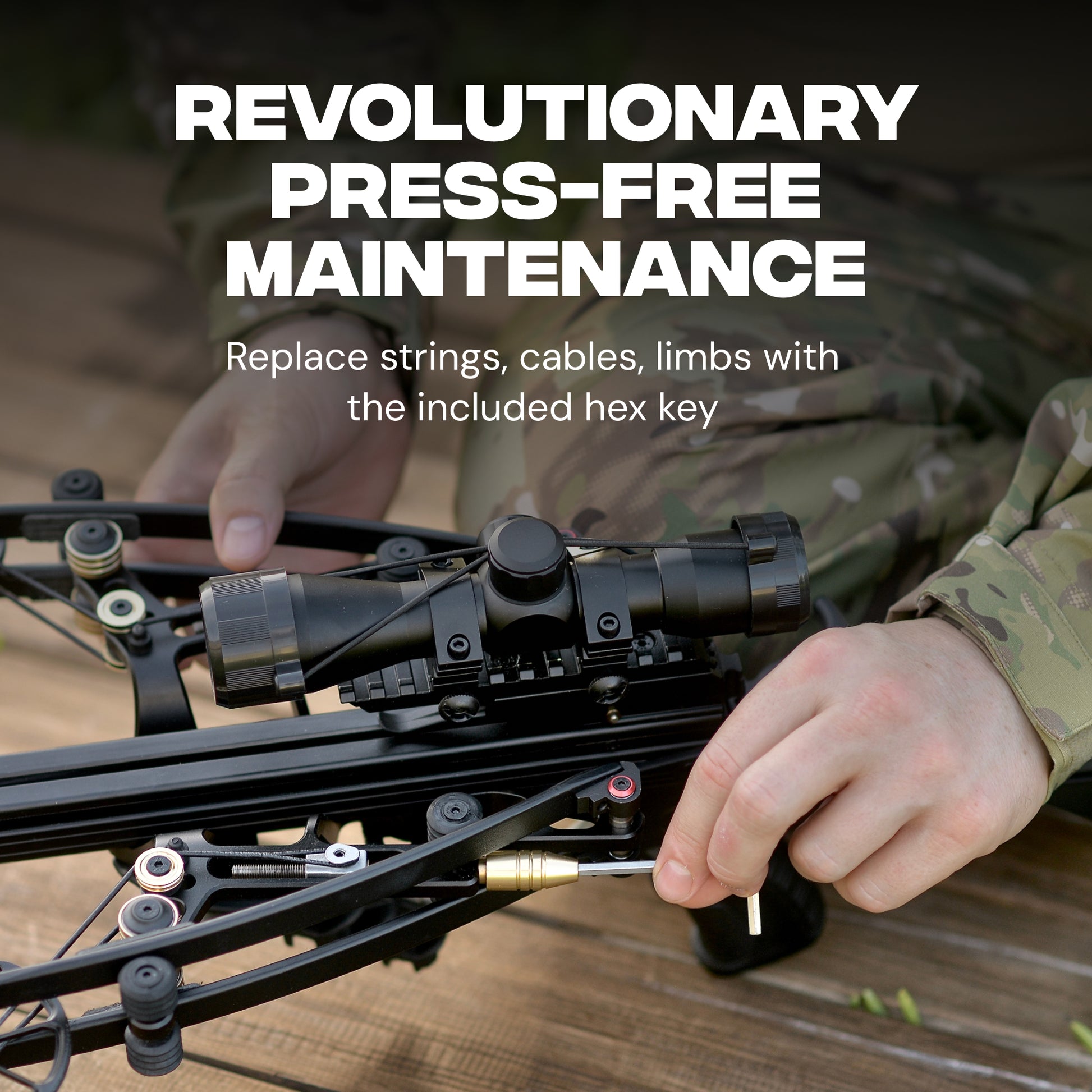 Hawkwing is designed to be maintained in the field. With its press-free architecture, you can replace the string, cables, or even limbs using only a standard hex key. The dual-cable layout keeps limbs synchronized to reduce vibration, push more energy into the bolt, and extend the life of your system. Limb poundage can be tuned to change arrow speed by roughly ±30–40 FPS, letting you match the bow to different bolt weights and shooting styles.