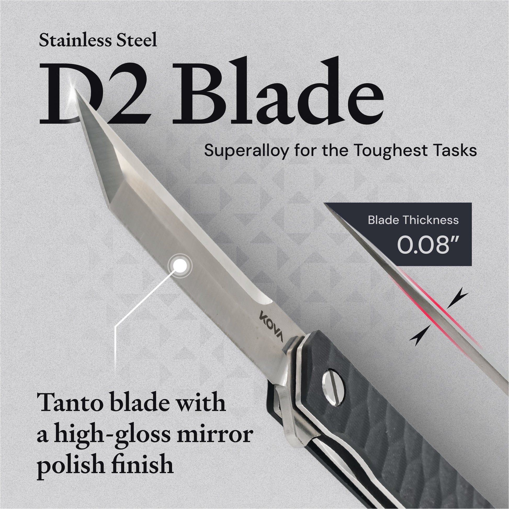 - 3.5” Tanto Blade with Mirror Polish – Razor-sharp D2 steel for durability and sleek presentation.