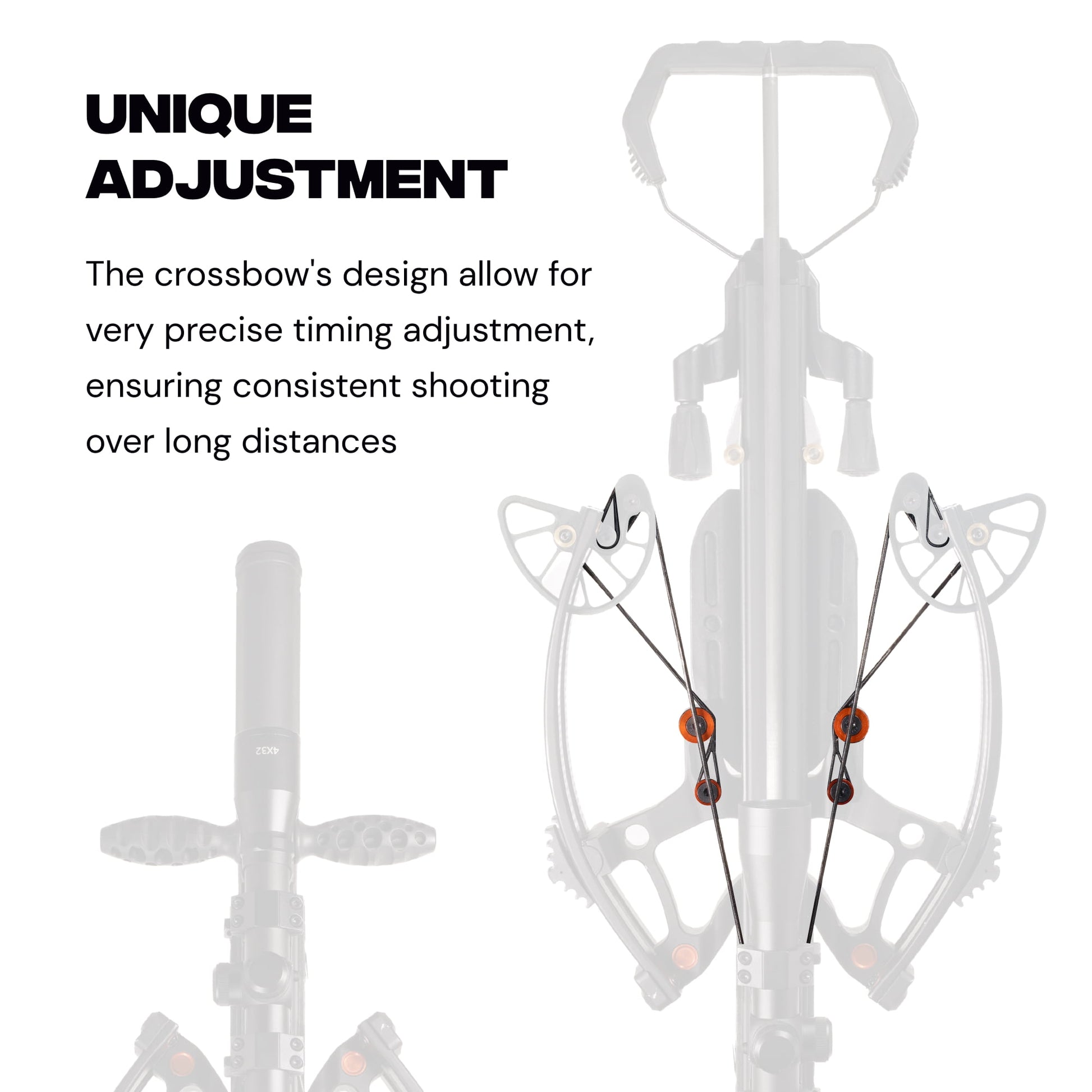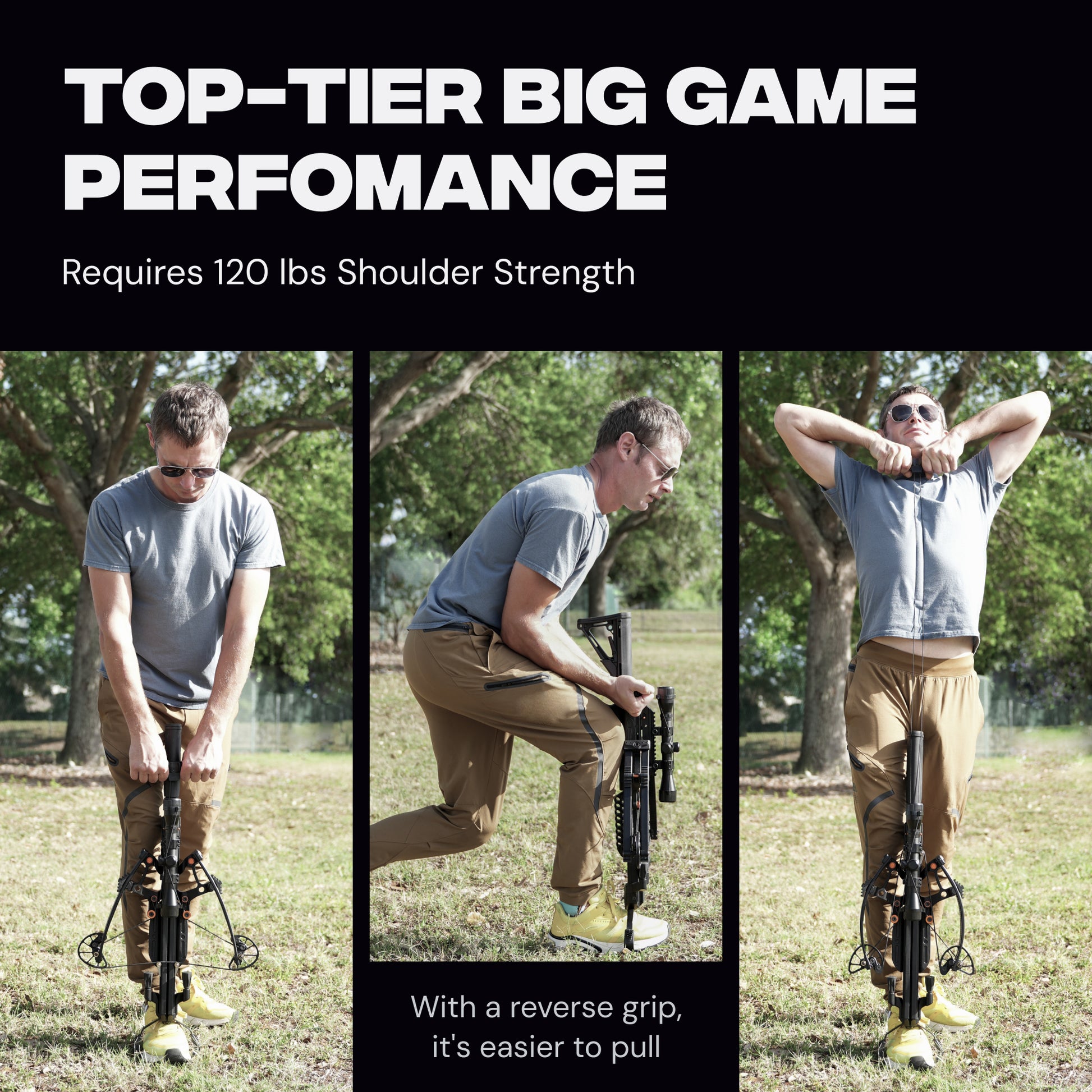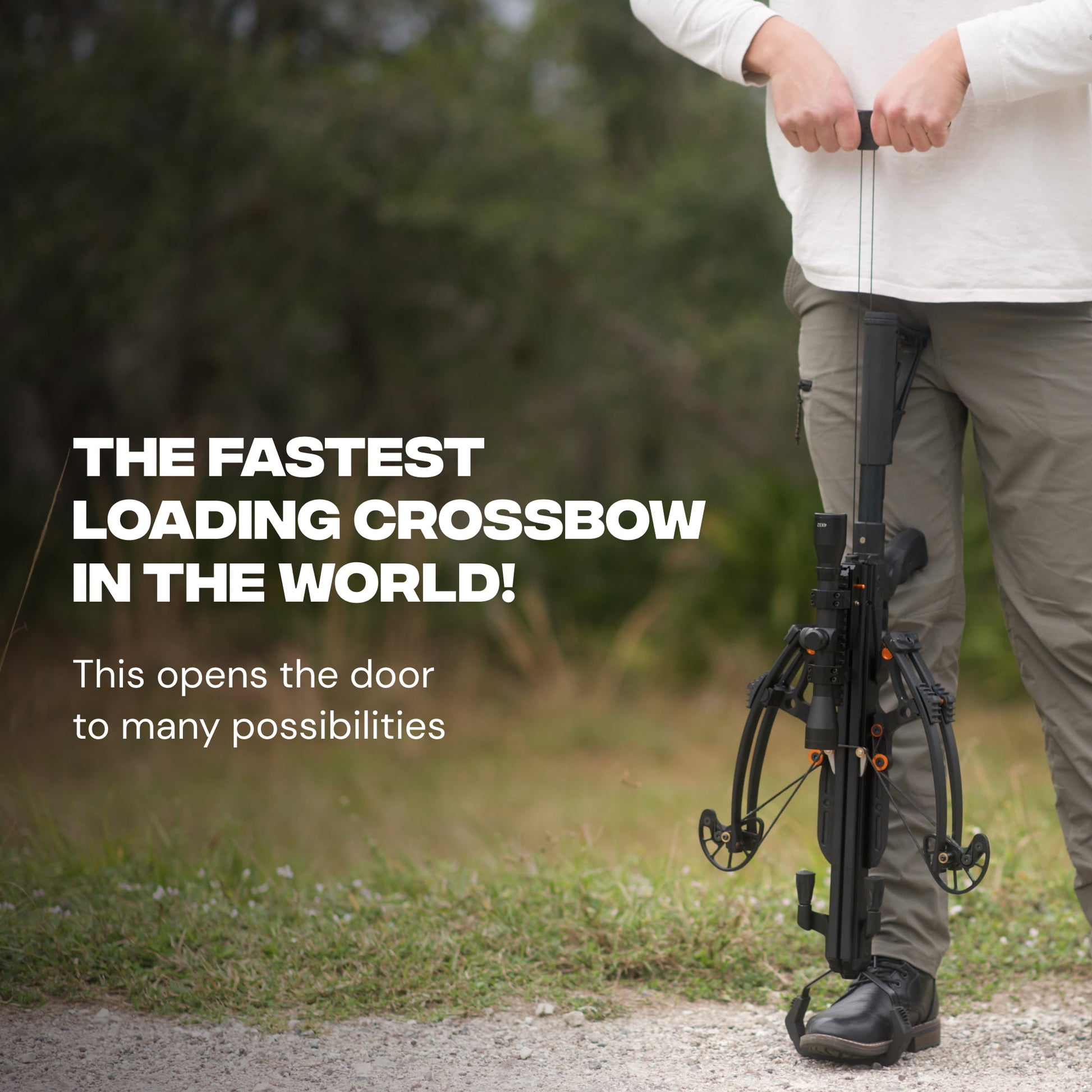 The built-in self-retracting cord tensioner makes the MEGABAT Reverse the fastest loading crossbow in the world, allowing for quick, easy, and silent reloading. Weighing just 9.28 lbs and constructed from high-grade materials such as metal, polymer, and 6061 T6 aluminum, this crossbow combines durability with portability, making it an ideal companion in any environment.