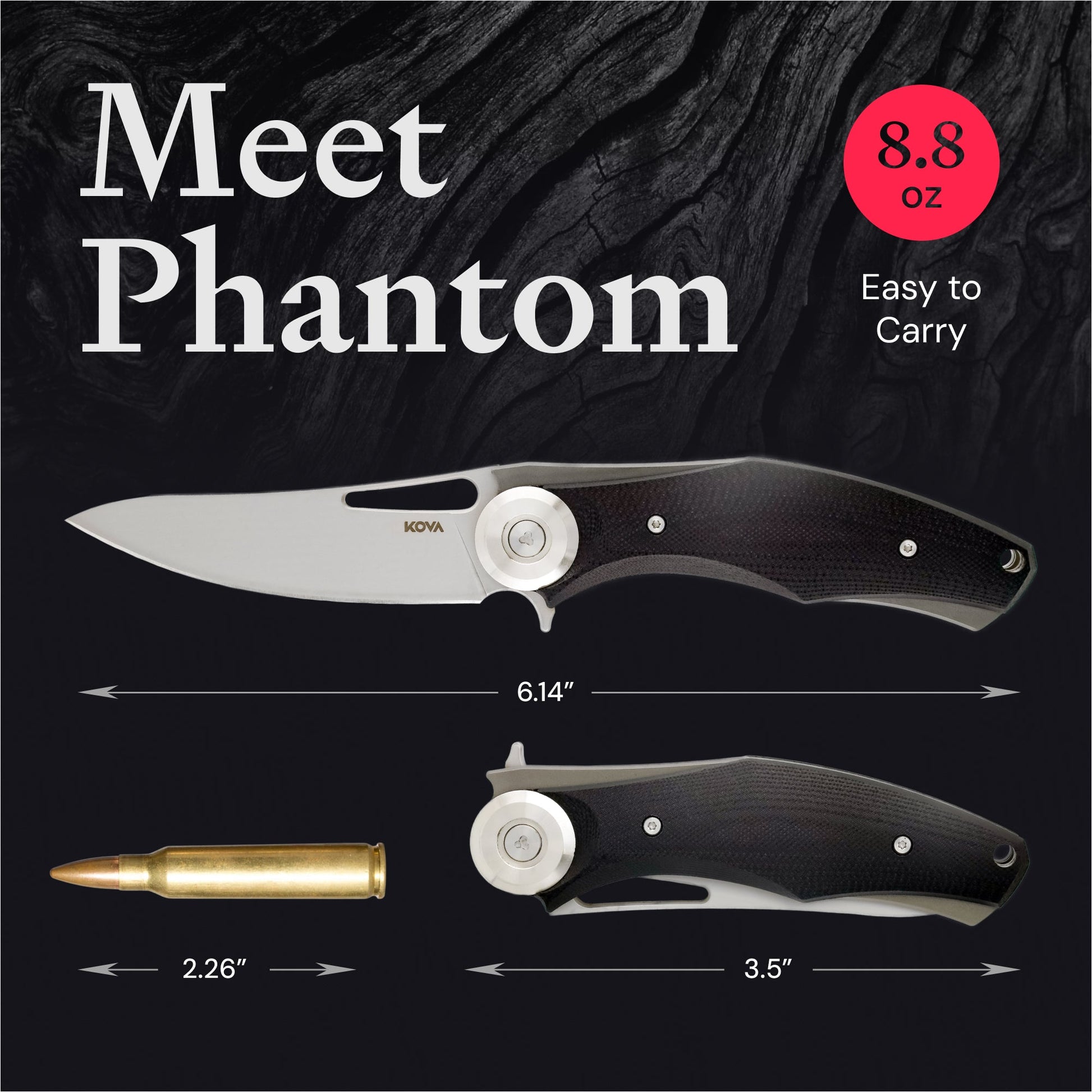 Its ergonomic handle combines durable G10 scales with stainless steel construction, providing a secure and comfortable grip even in tough conditions. The liner lock mechanism ensures safe use, while the ball-bearing pivot system enables fast, smooth one-handed blade deployment. With a total length of 156mm and weighing 250g, the Phantom is compact, solid, and built for performance.