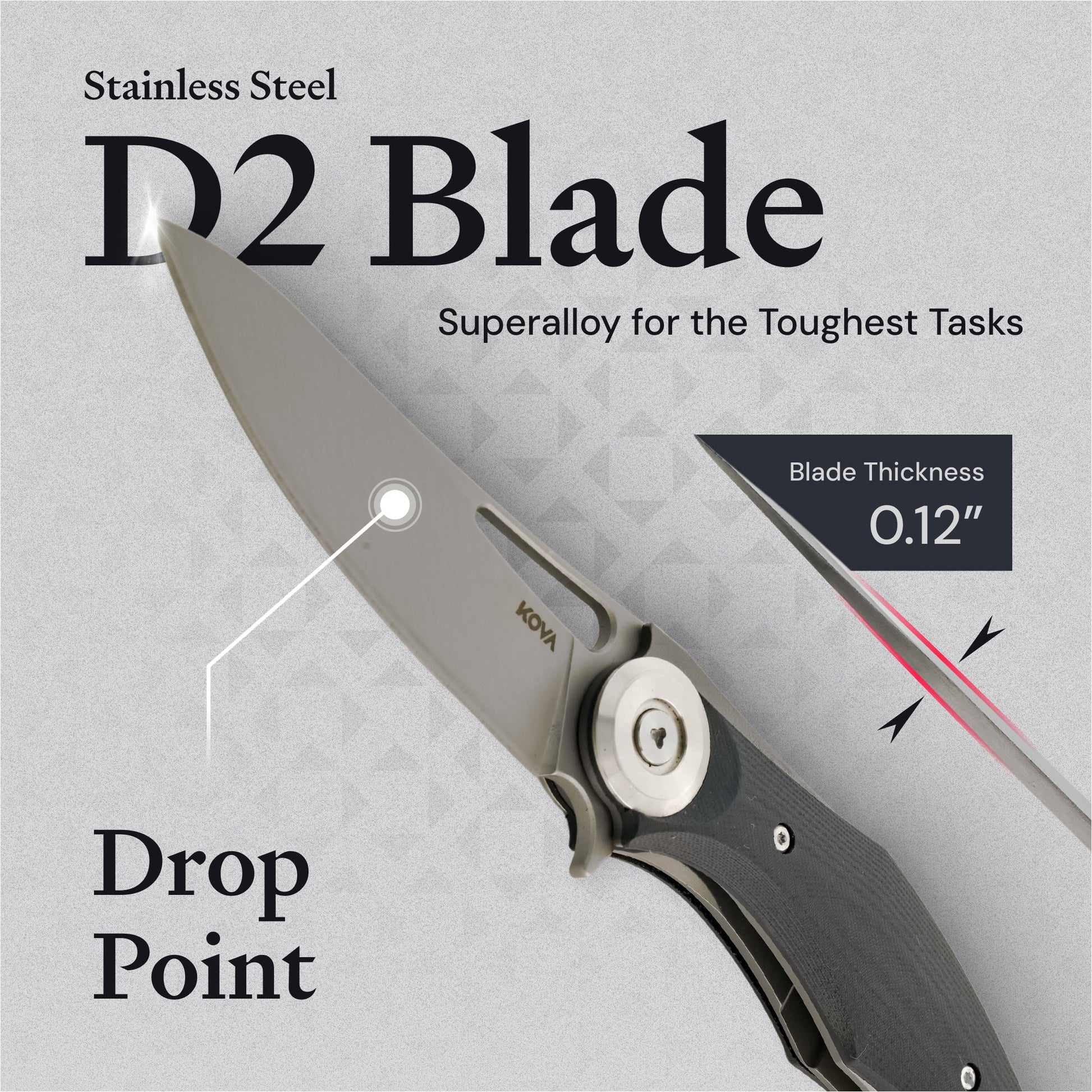 - Premium D2 Steel Blade (67mm) – High hardness (60–61 HRC) for long-lasting edge performance.