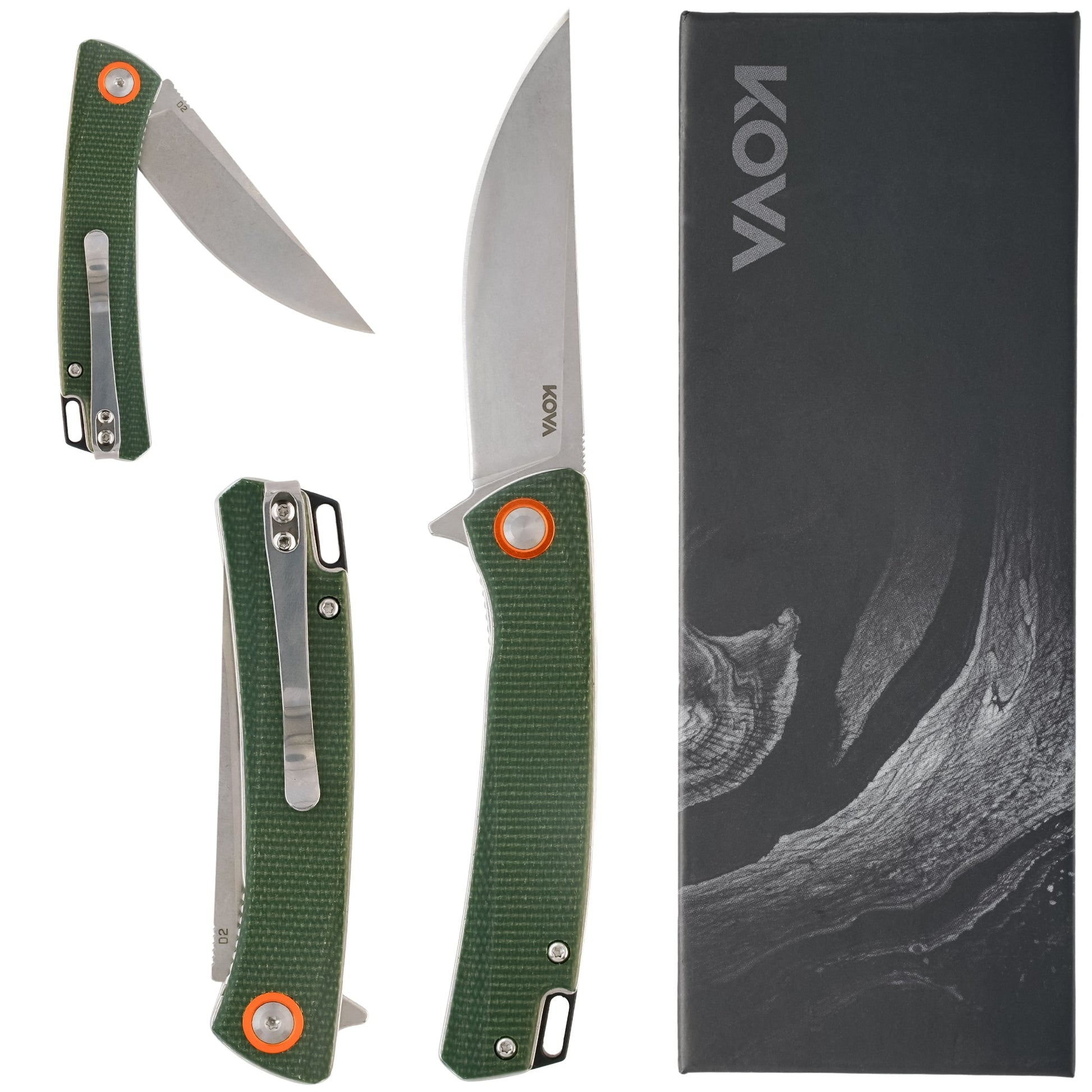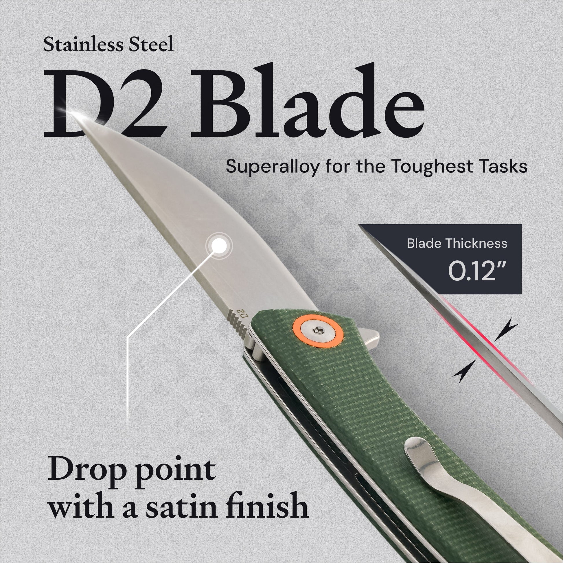 - 2.95” D2 Drop-Point Blade – Satin-finished for durability, corrosion resistance, and edge retention.