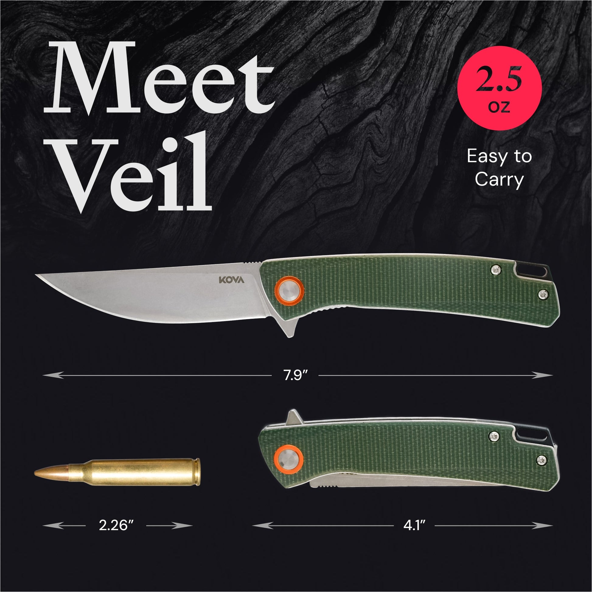 Weighing just 71 grams, the Veil is lightweight and easy to carry. The flipper tab and ball-bearing pivot allow fast one-handed deployment, while the liner lock ensures secure use. The handle’s ergonomic shape and texture provide confident grip and control during any task.