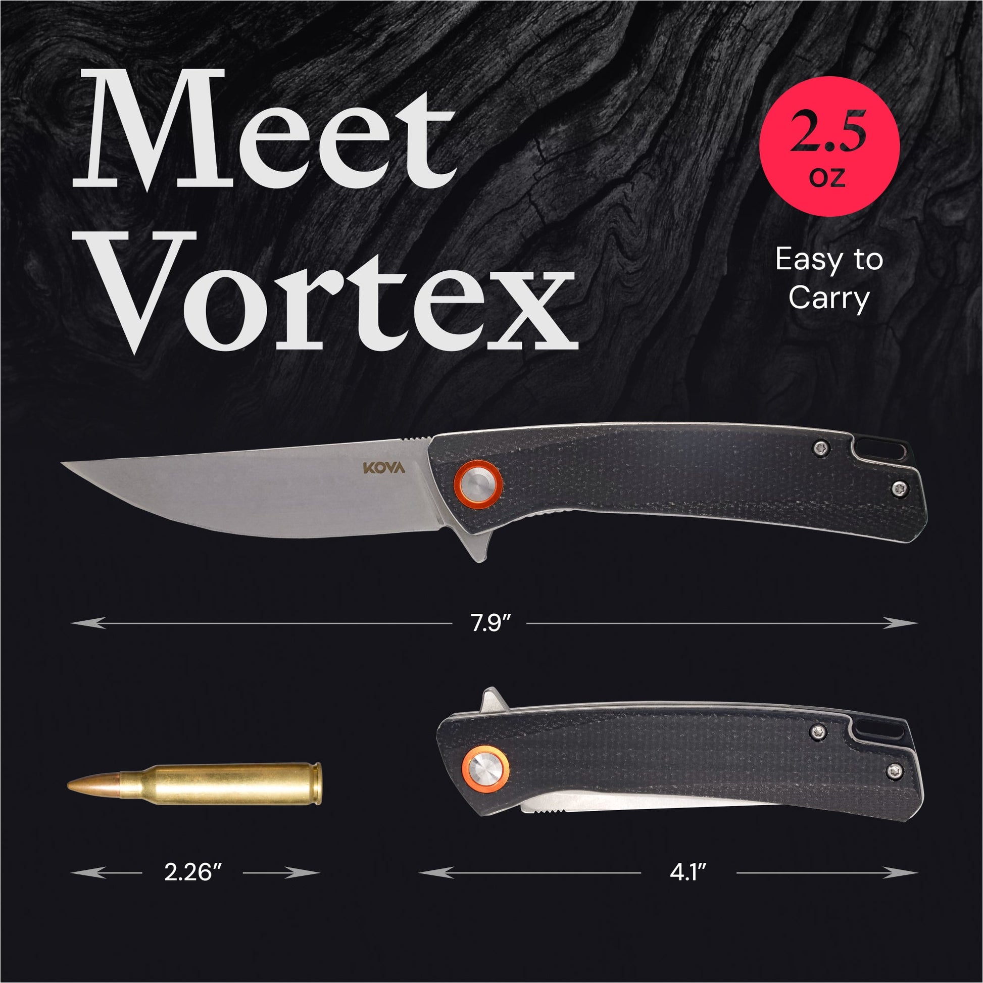The textured G10 Micarta handle, accented with a bold red ring, provides a secure, ergonomic grip, ensuring precision in every cut. Measuring 4.13 inches in length, the handle offers excellent control and comfort. The ball-bearing pivot system allows for effortless, one-handed deployment via a flipper tab, while the reinforced liner lock guarantees stability and safety during use. A stainless steel pocket clip and a lanyard loop add versatile carry options, making the Vortex a go-to tool for adventurers and tactical users.