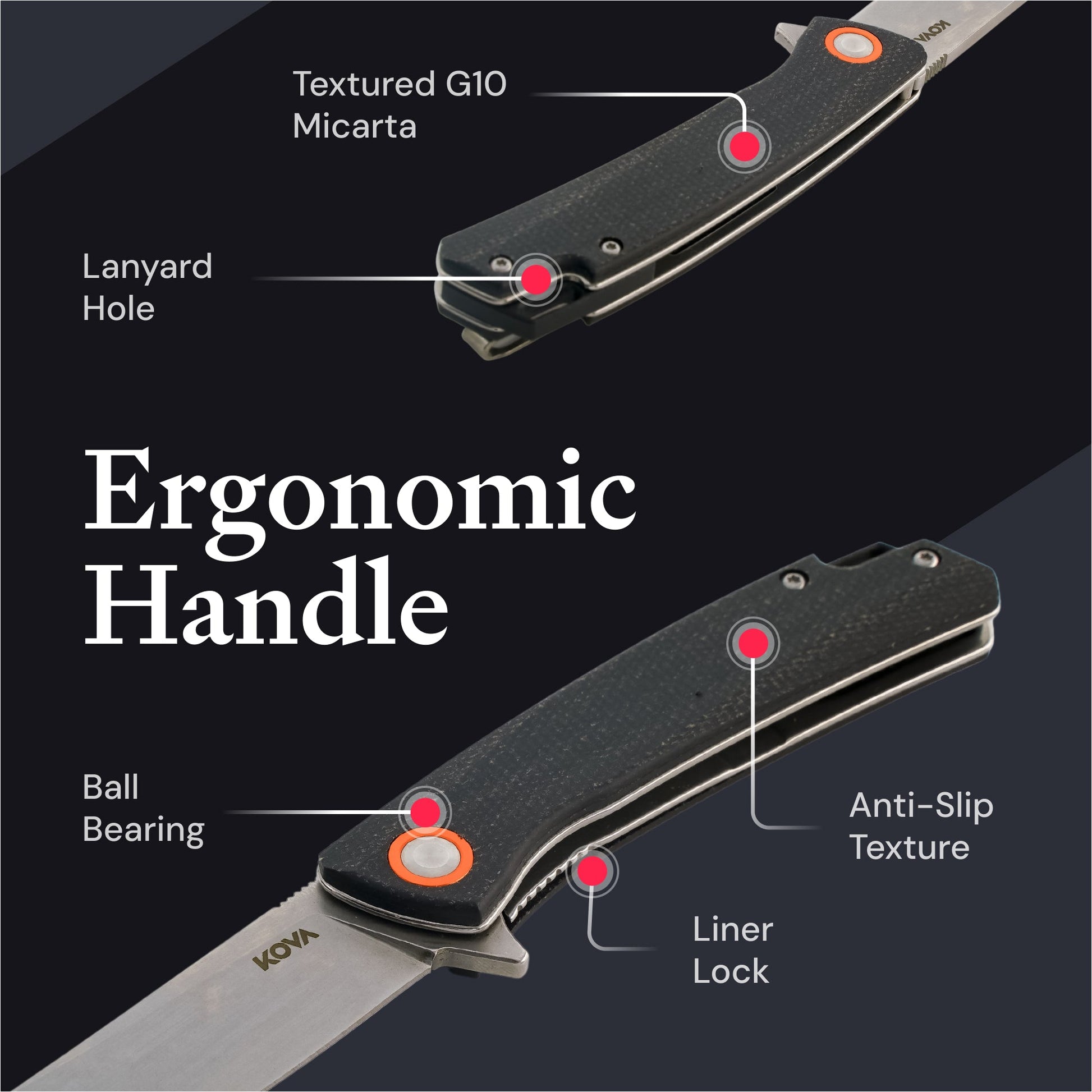 - Ergonomic, Secure Grip – Textured G10 Micarta handle with a striking red accent ring provides comfort, control, and a confident hold.